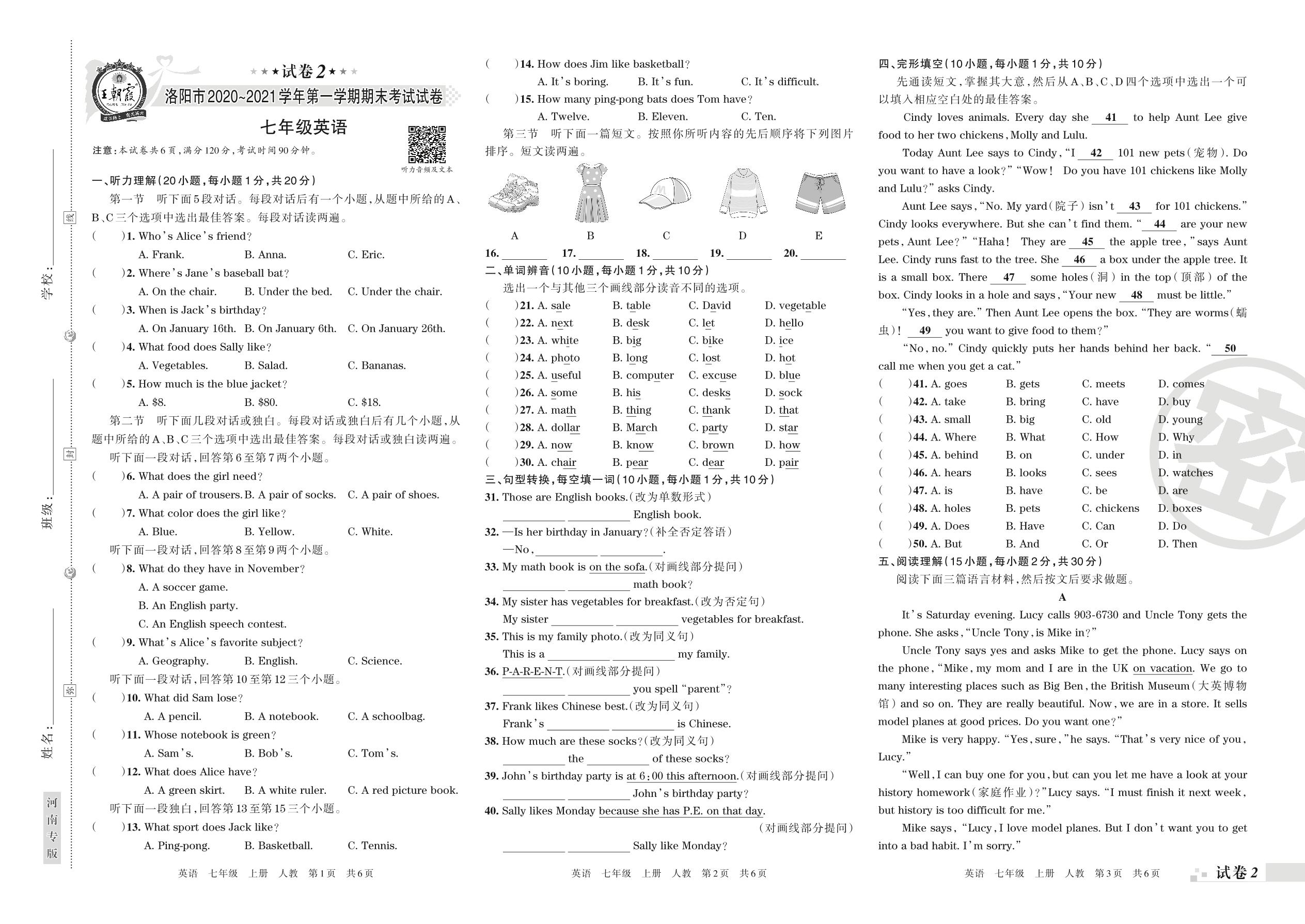洛阳市2020~2021学年第一学期期末考试试卷七年级英语(人教版)【2】