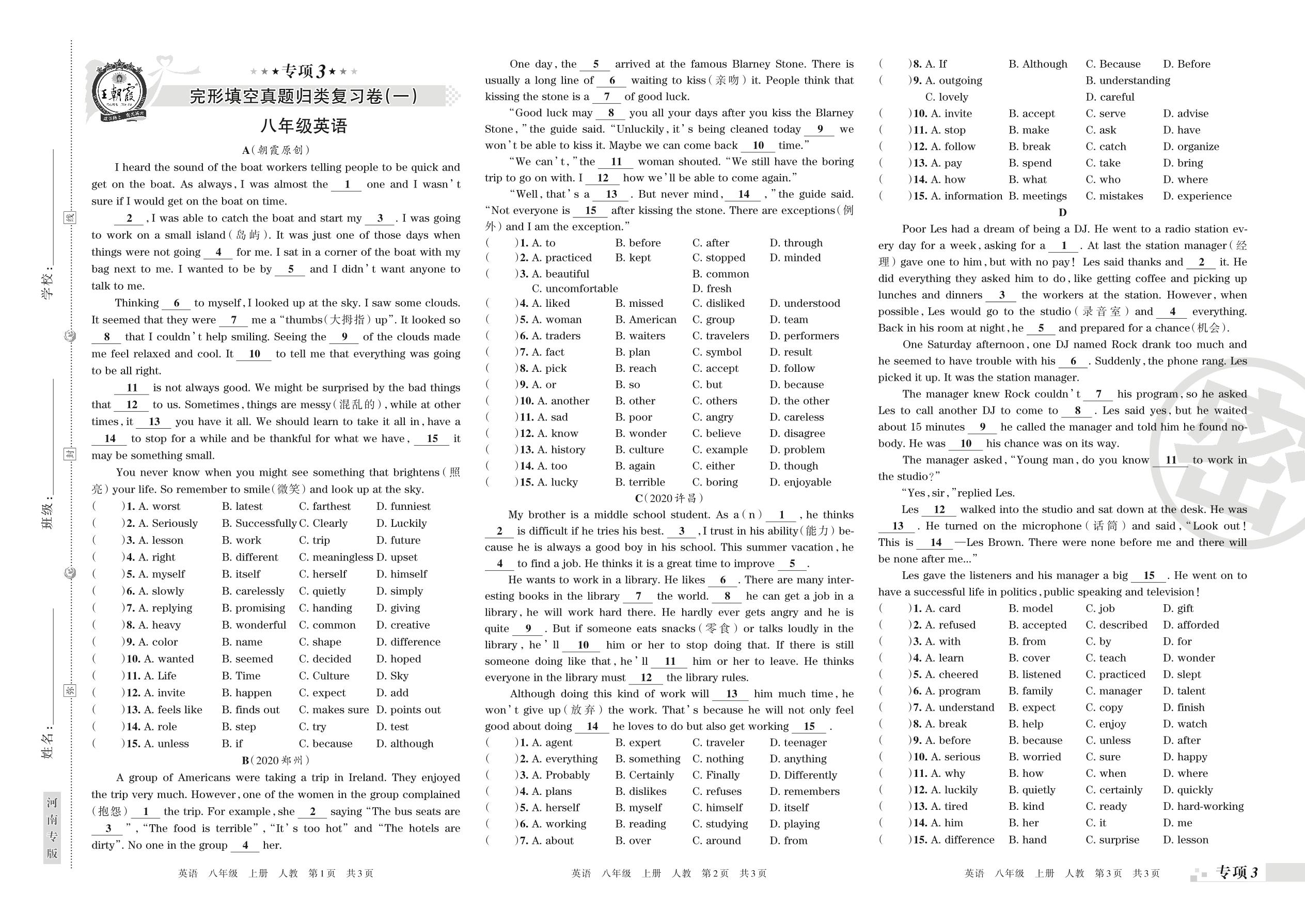王朝霞期末专项卷——完形填空真题归类复习卷(一)八年级上册英语(人教版)_R211206112117226【3】