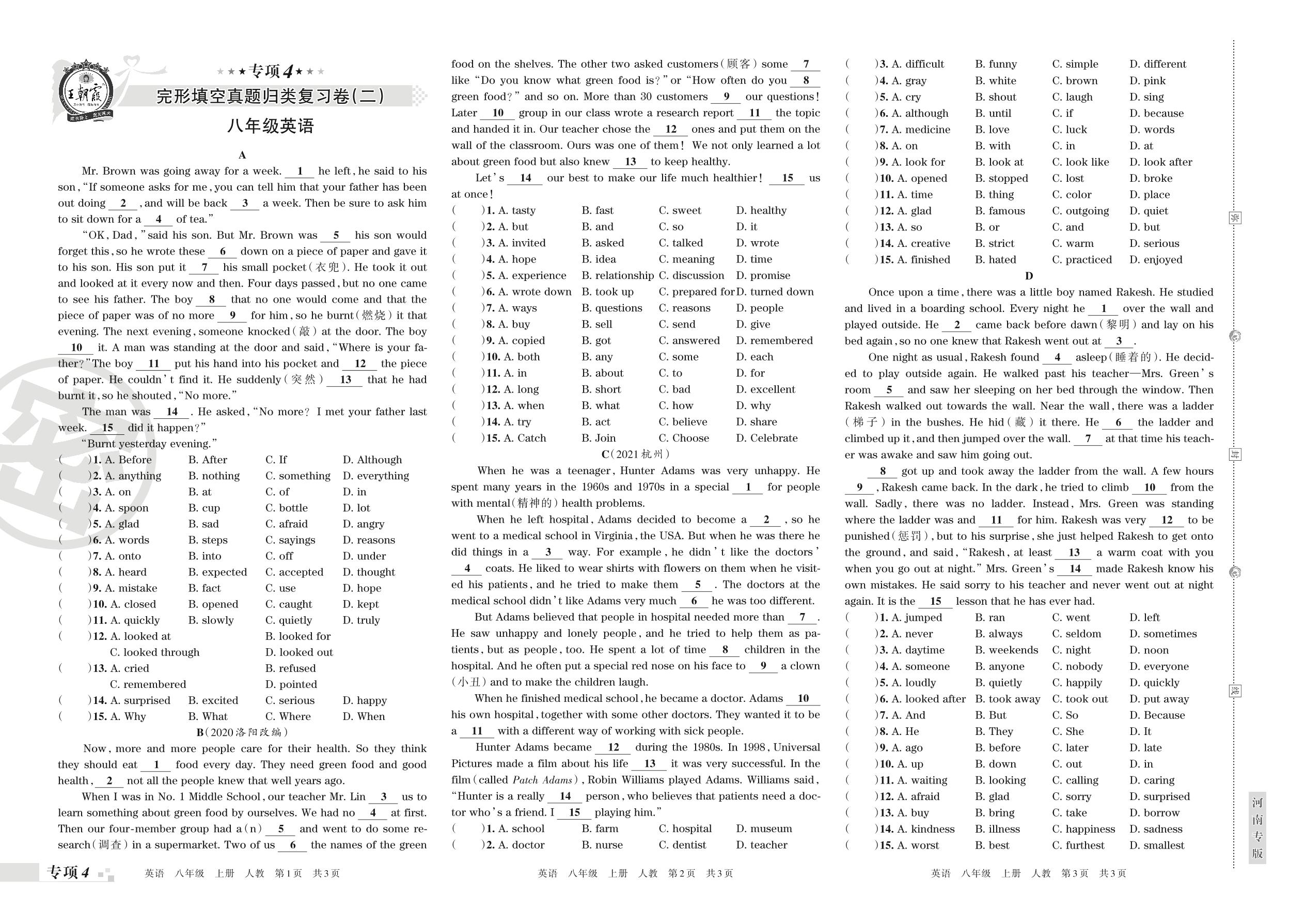 王朝霞期末专项卷——完形填空真题归类复习卷(二)八年级上册英语(人教版)_R211206112117288【4】
