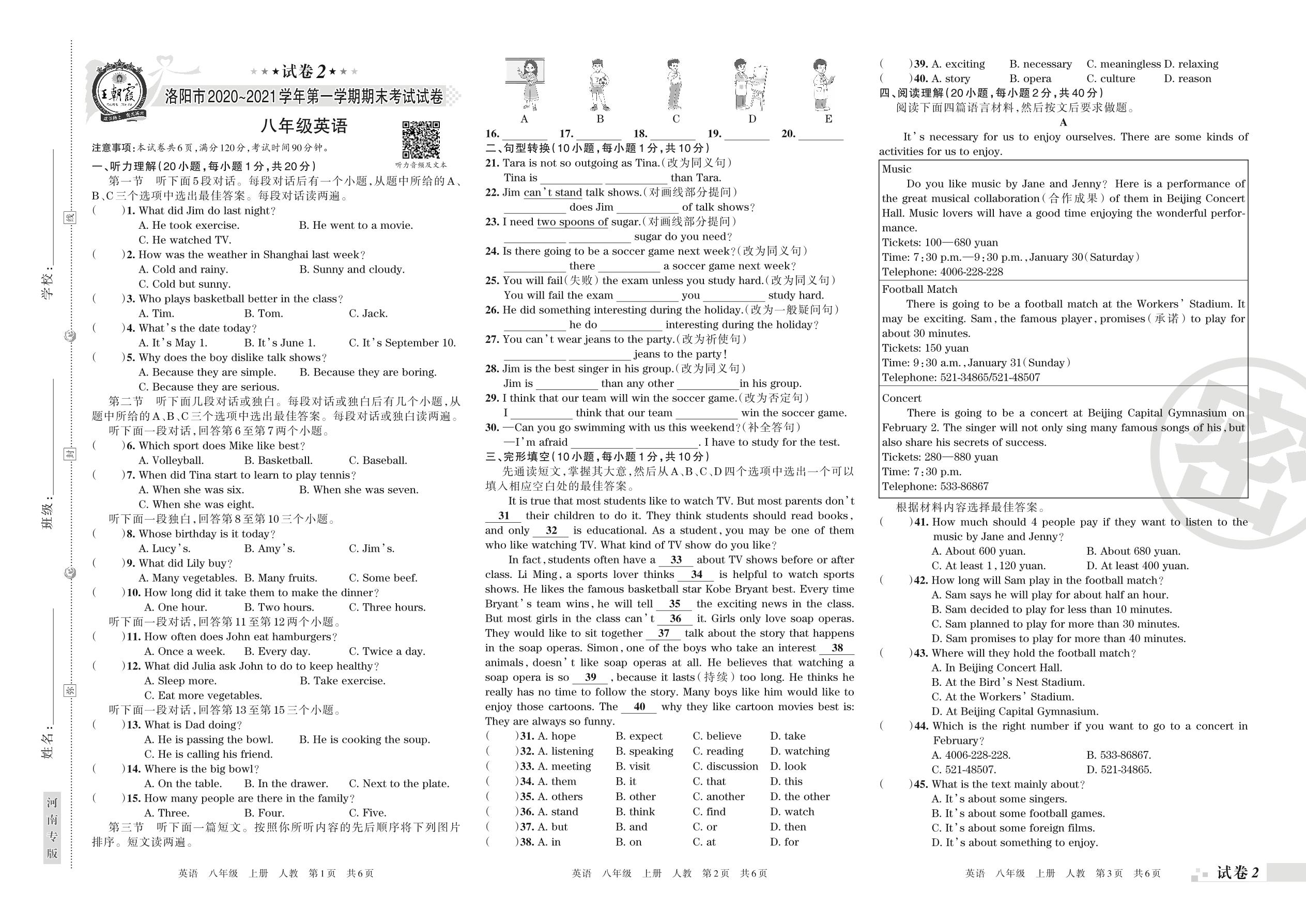 洛阳市2020~2021学年第一学期期末考试试卷八年级英语(人教版)【2】