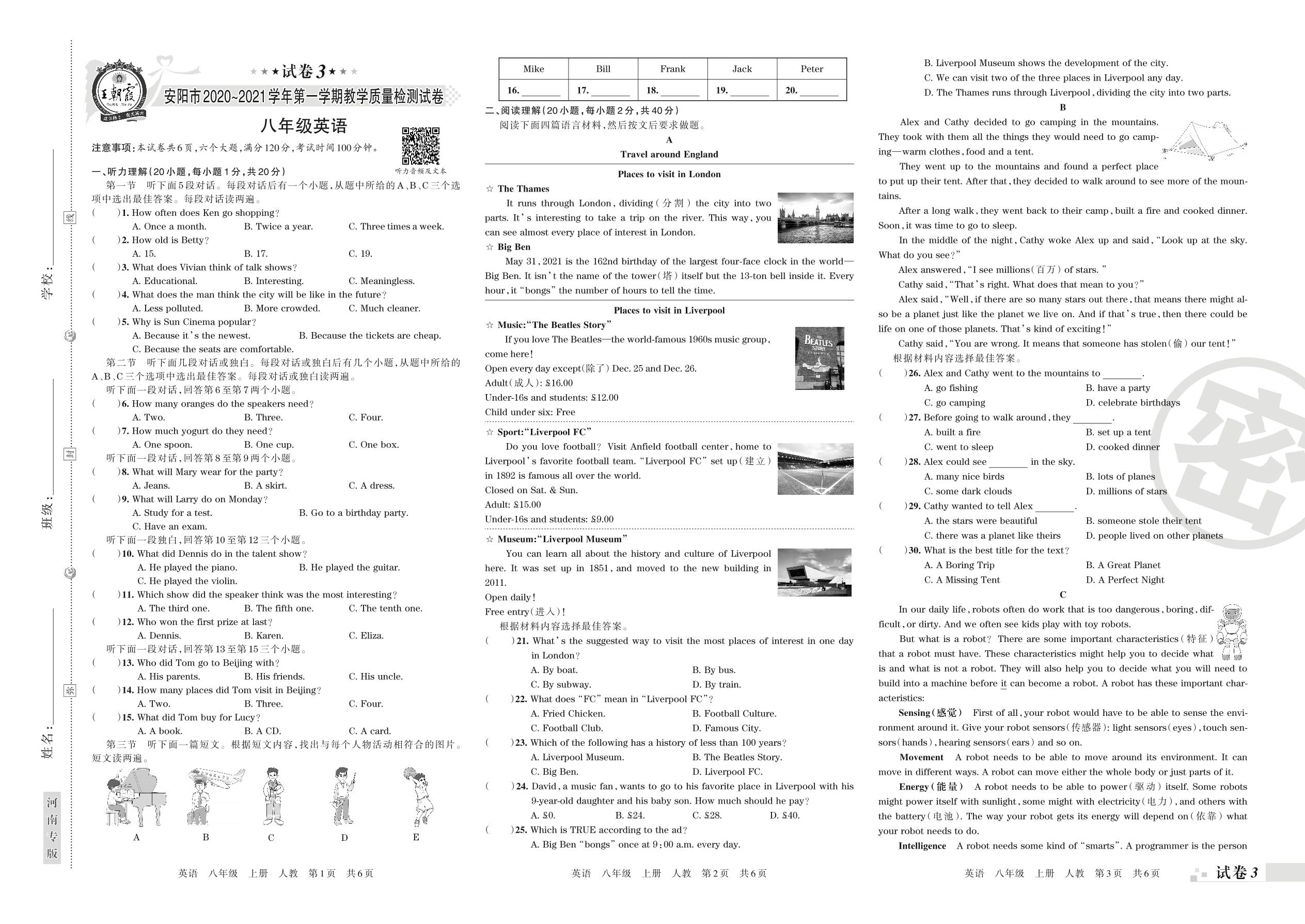 安阳市2020~2021学年第一学期教学质量检测试卷八年级英语(人教版)【3】