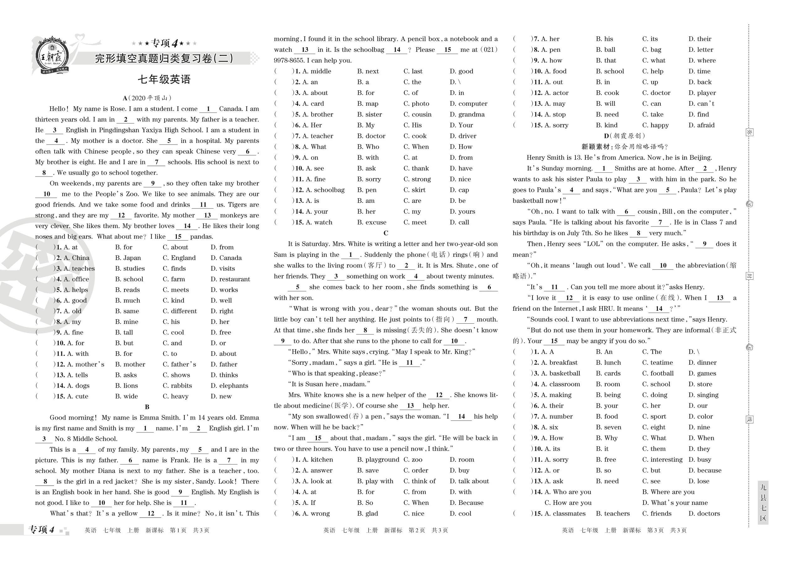 王朝霞期末专项卷——完形填空真题归类复习卷(二)七年级上册英语(新课标版)_R211207092443749【4】
