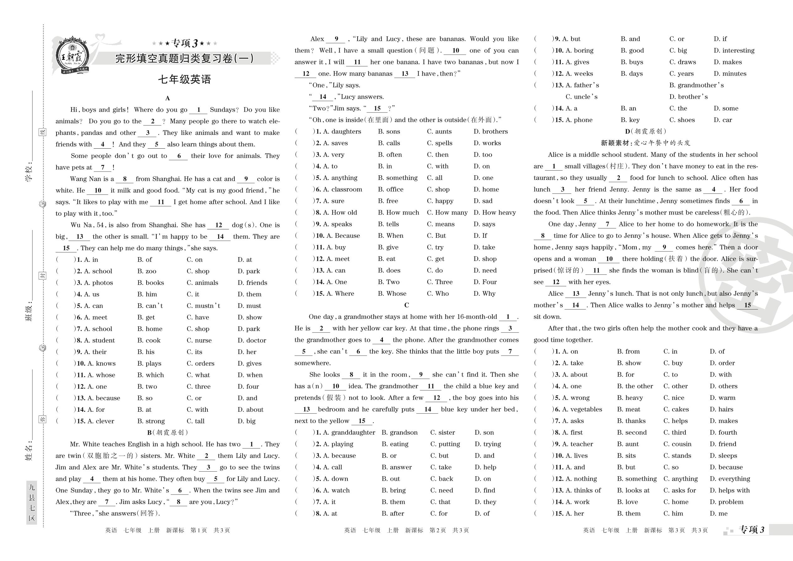 王朝霞期末专项卷——完形填空真题归类复习卷(一)七年级上册英语(新课标版)_R211207092443279【3】