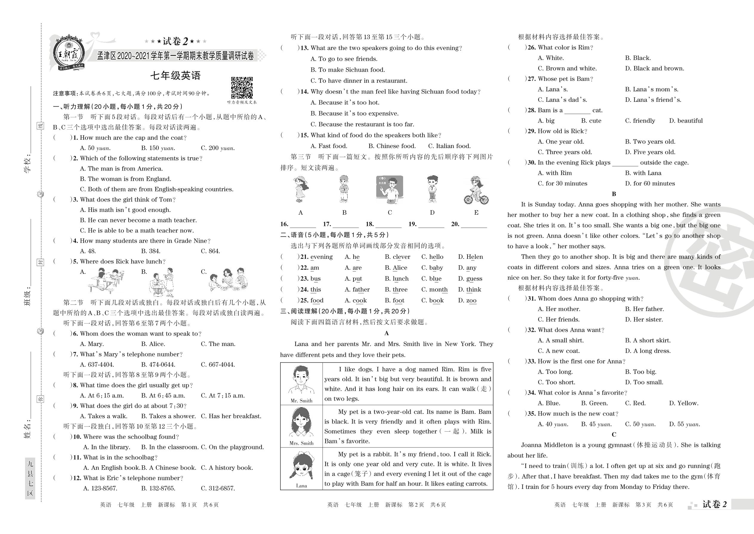 孟津区2020~2021学年第一学期期末教学质量调研试卷七年级英语(新课标版)【2】
