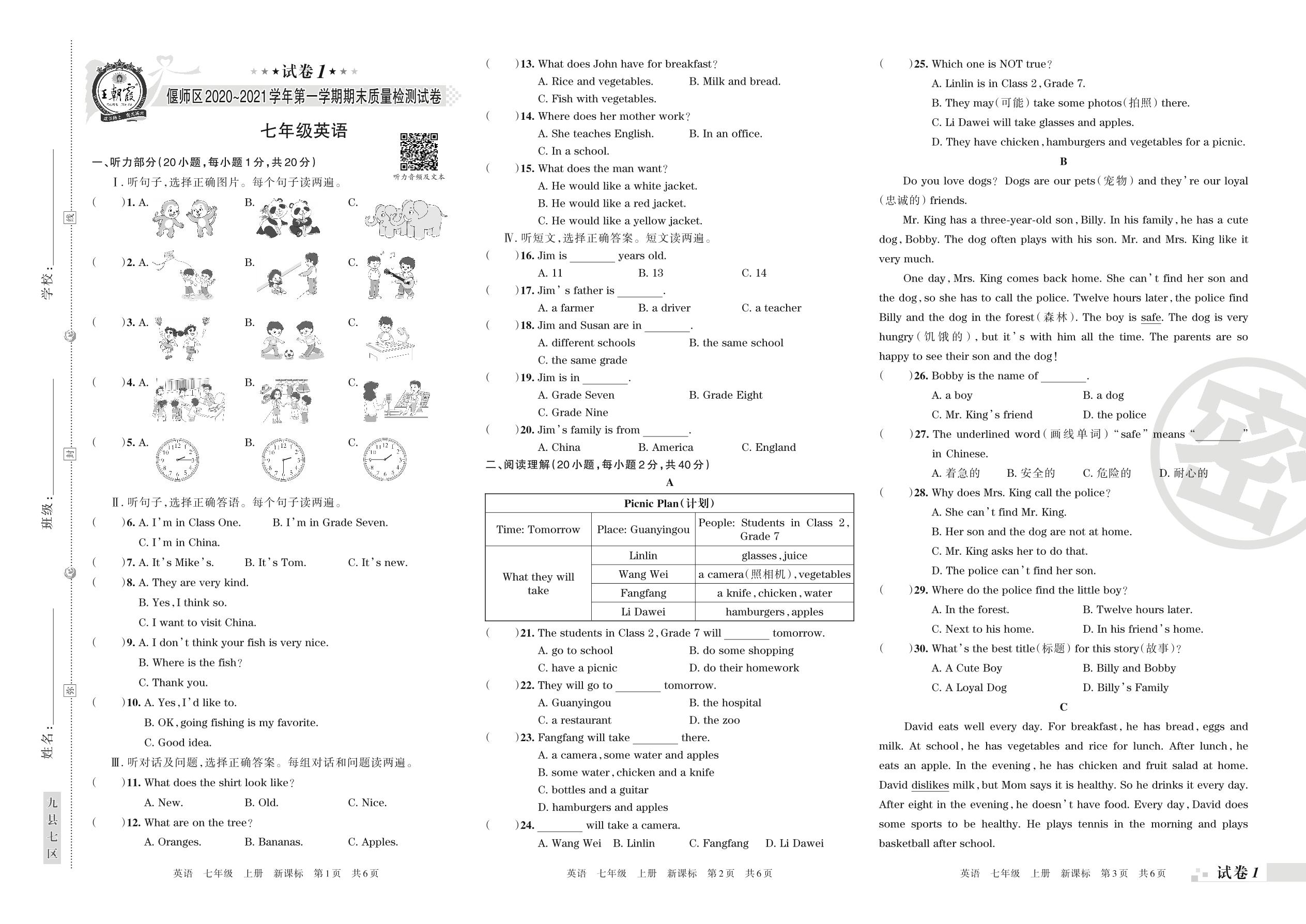 七年级英语新课标版上册期末卷