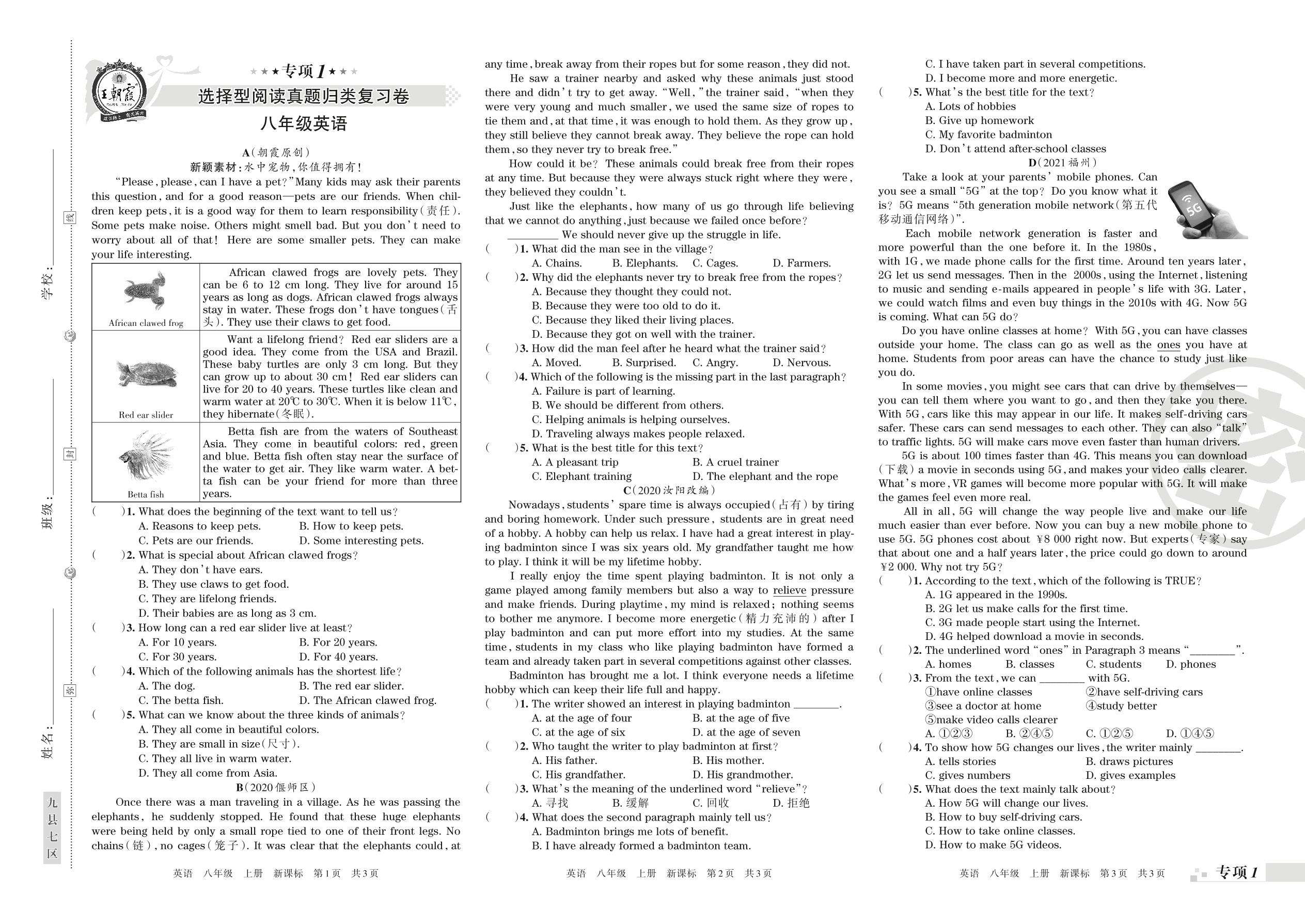 王朝霞期末专项卷——选择型阅读真题归类复习卷八年级上册英语(新课标版)_R211207092818059【1】