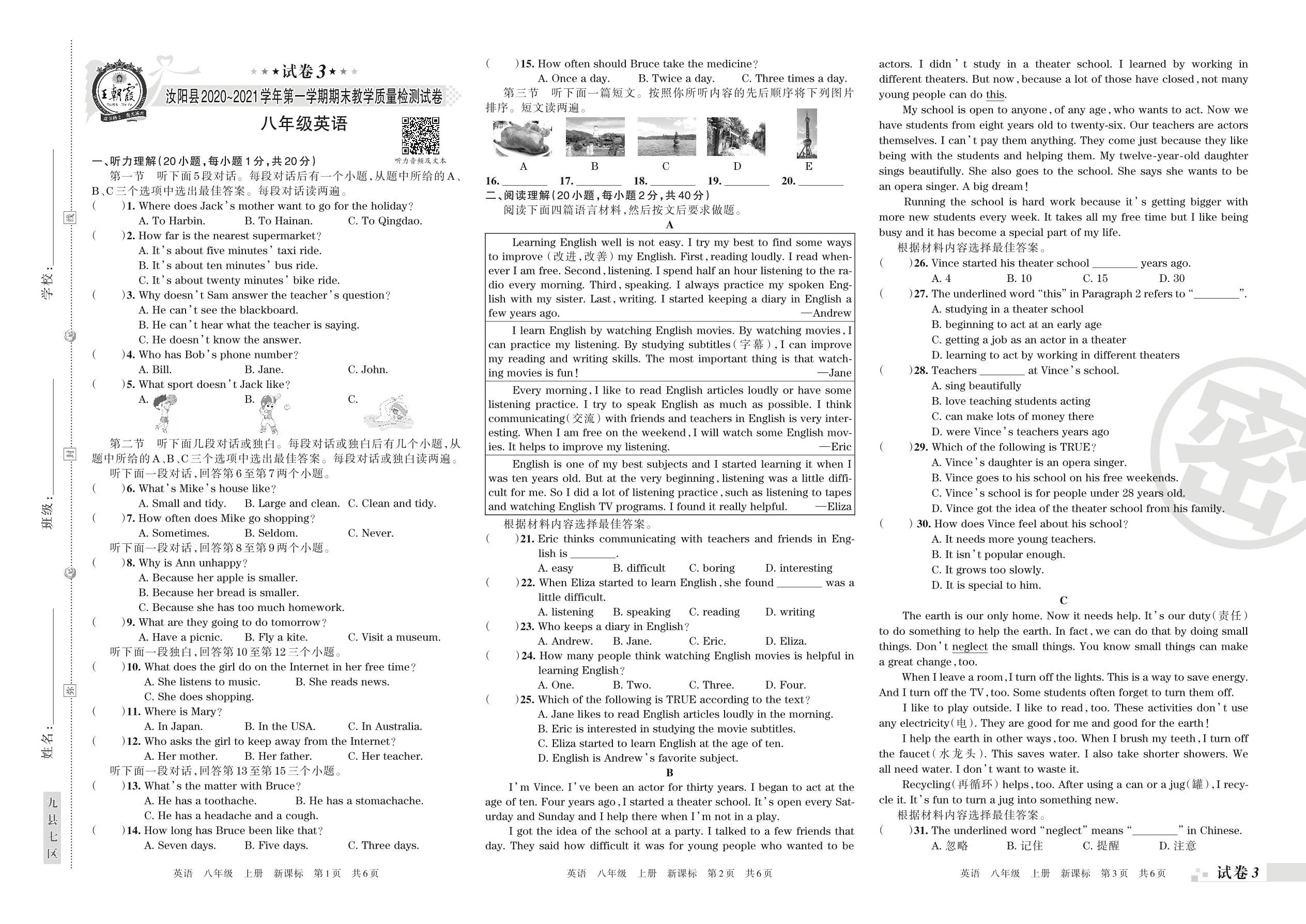 汝阳县2020~2021学年第一学期期末教学质量检测试卷八年级英语(新课标版)【3】