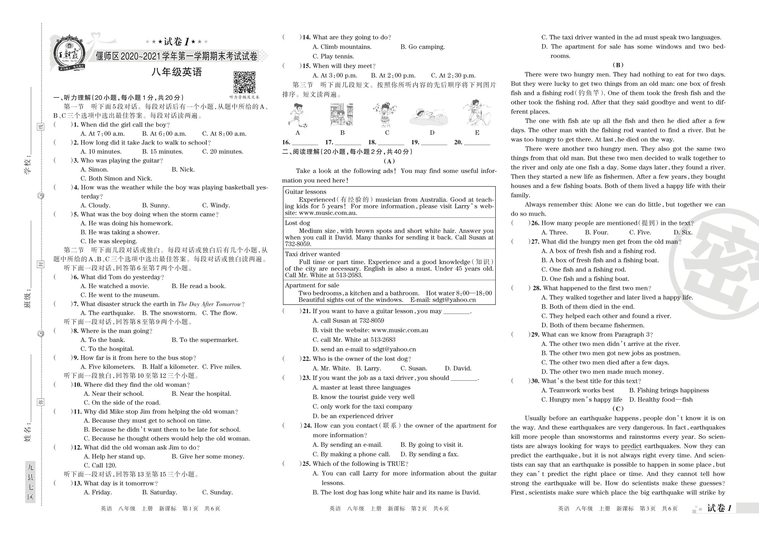 偃师区2020~2021学年第一学期期末考试试卷八年级英语(新课标版)【1】