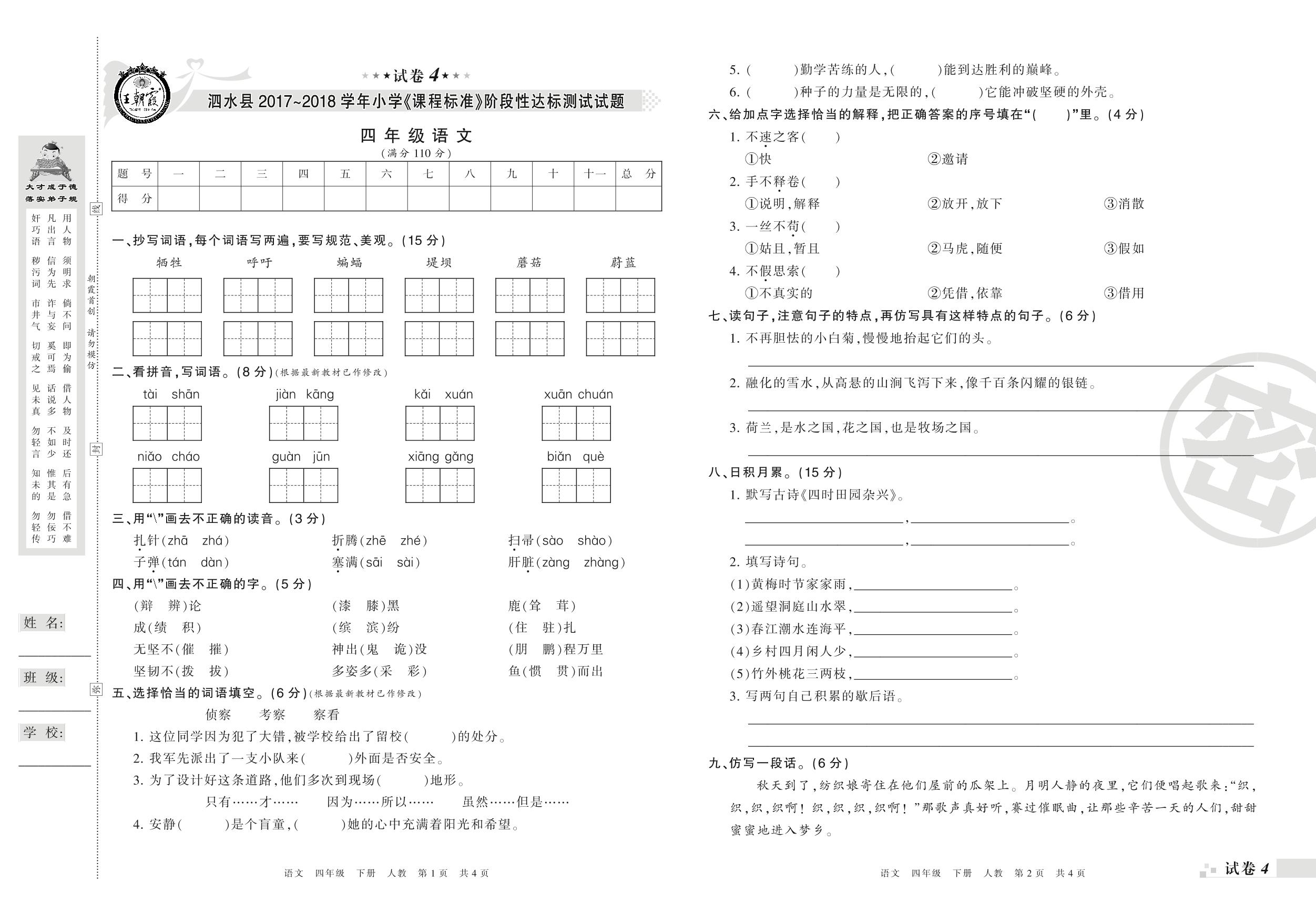 2017-2018学年第二学期济宁市泗水县四年级语文试卷(人教版)【4】