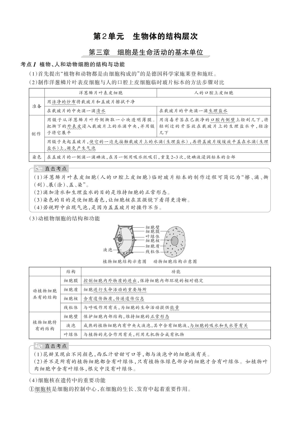 王朝霞期末过课本——知识梳理 第2单元 生命体的结构层次七年级上册生物(苏教版)【2】