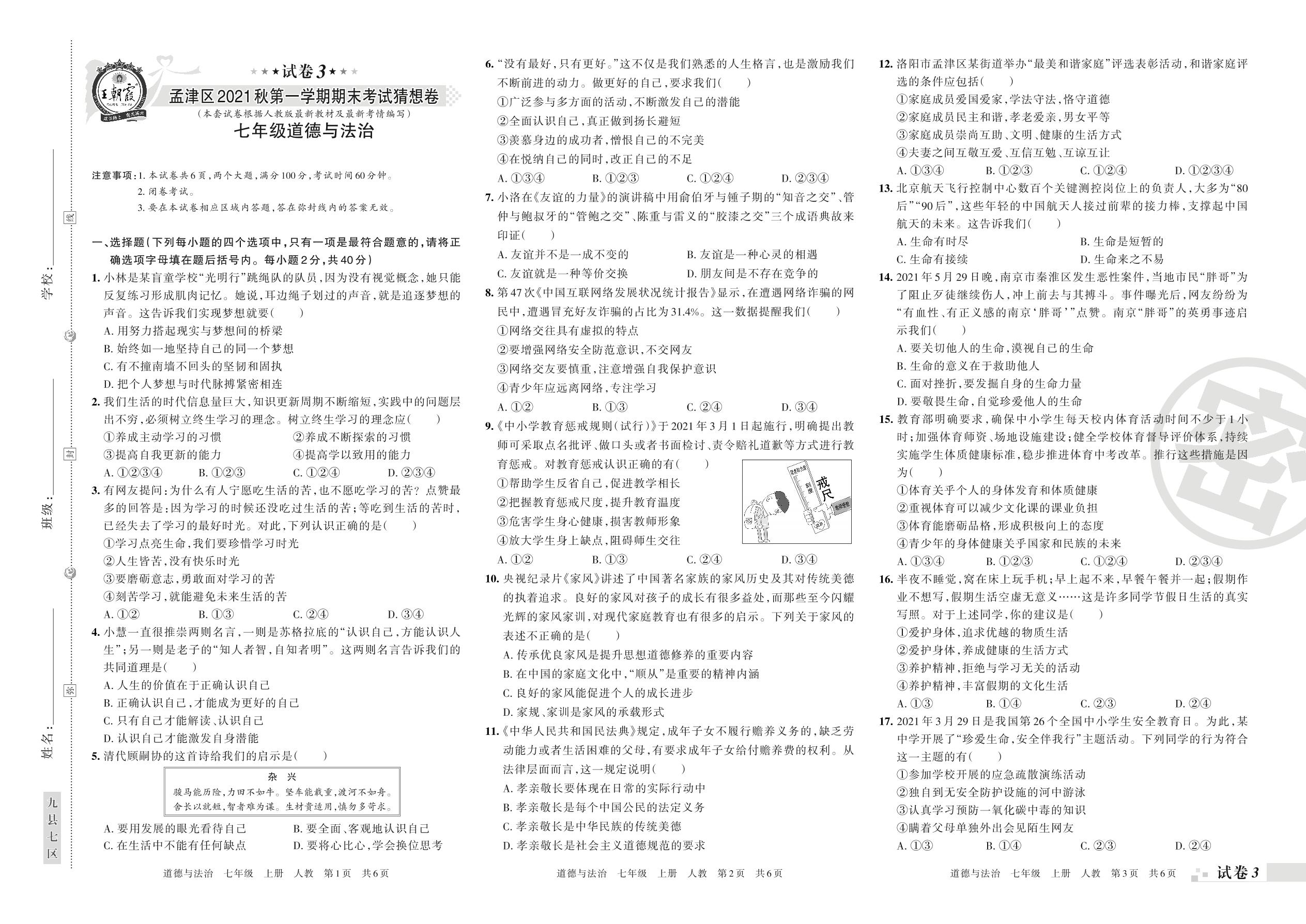 孟津区2021秋第一学期期末考试猜想卷七年级道德与法治(人教版)【3】