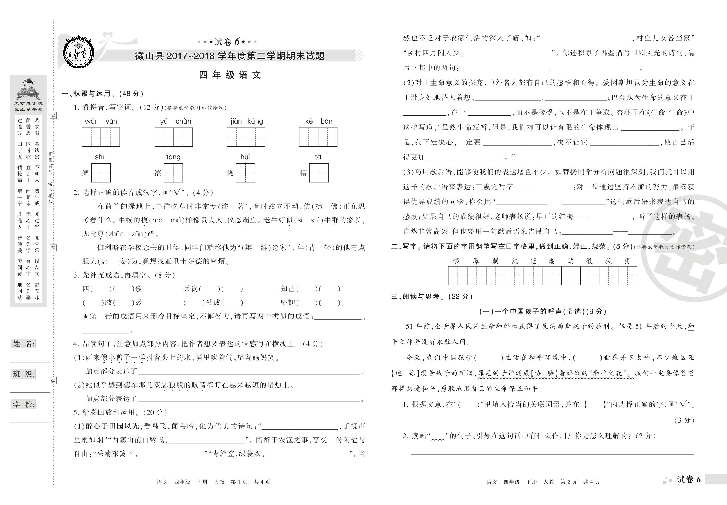 四年级语文人教版下册期末卷