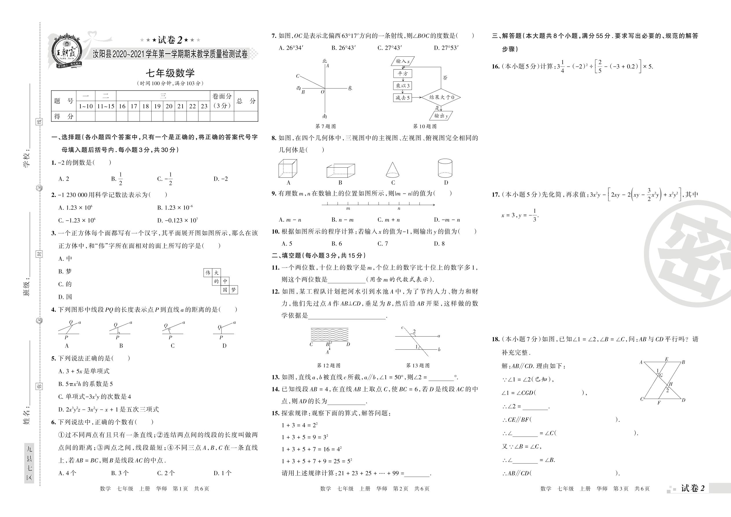 汝阳县2020~2021学年第一学期期末教学质量检测试卷七年级数学(华师版)【2】