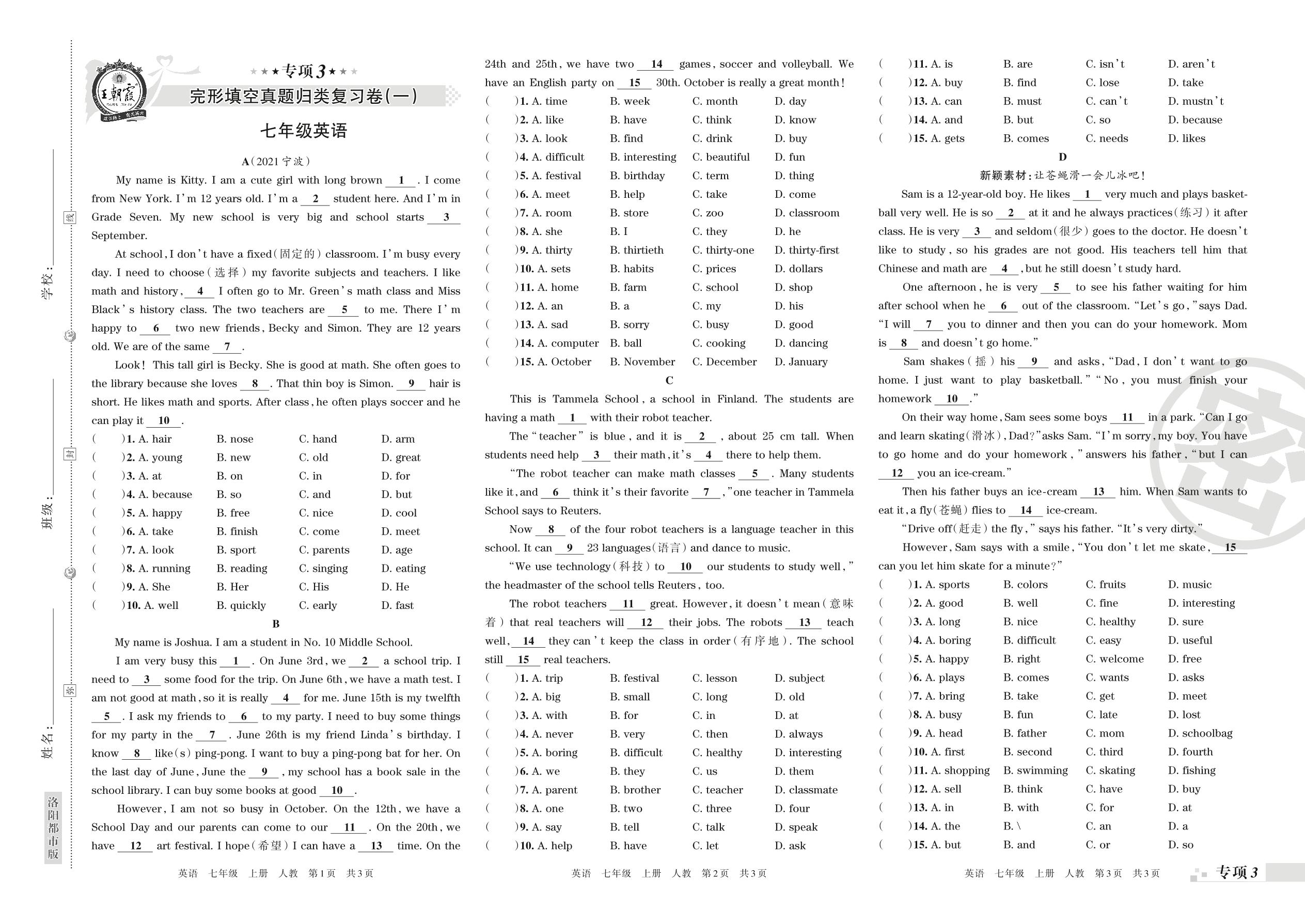 王朝霞期末专项卷——完形填空真题归类复习卷(一)七年级上册英语(人教版)_R211207100545293【3】