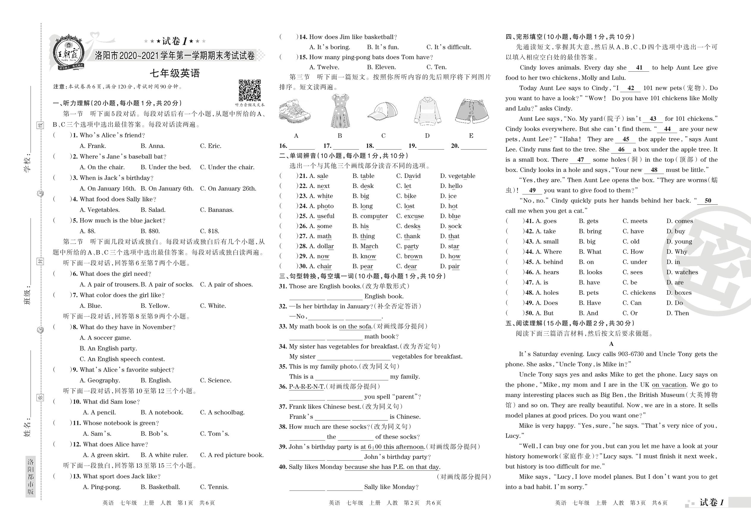 洛阳市2020~2021学年第一学期期末考试试卷七年级英语(人教版)【1】