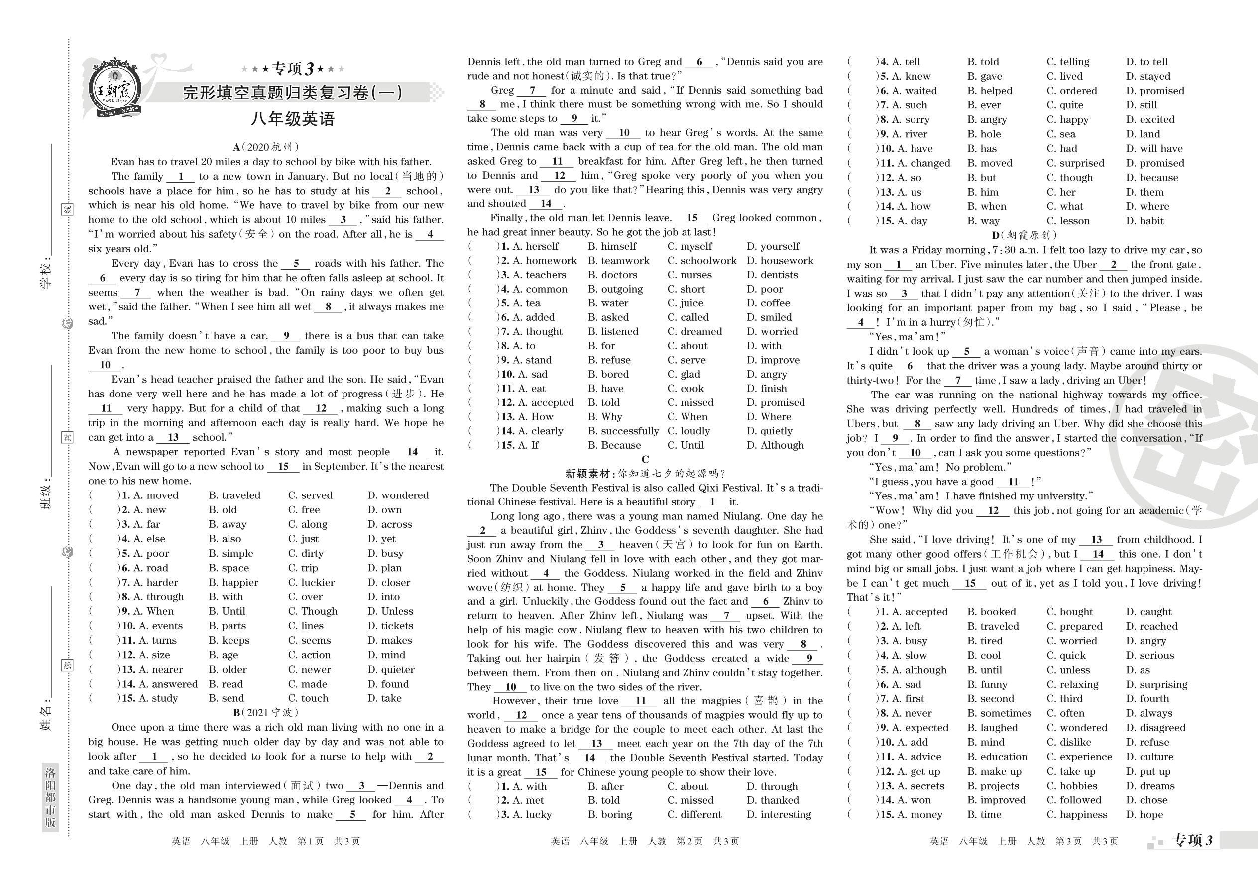王朝霞期末专项卷——完形填空真题归类复习卷(一)八年级上册英语(人教版)_R211207101054171【3】