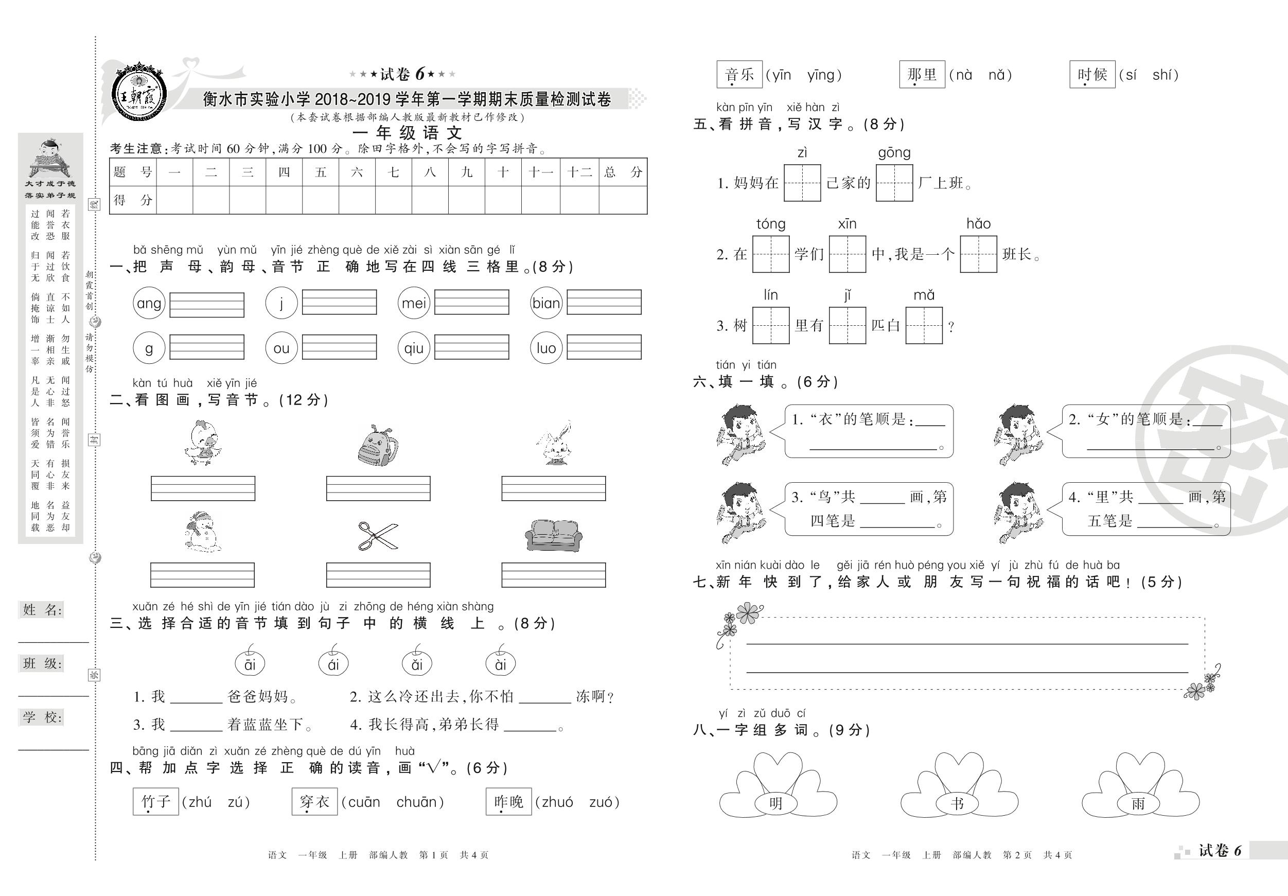 2018-2019学年第一学期衡水市实验小学一年级语文试卷(人教版)【6】