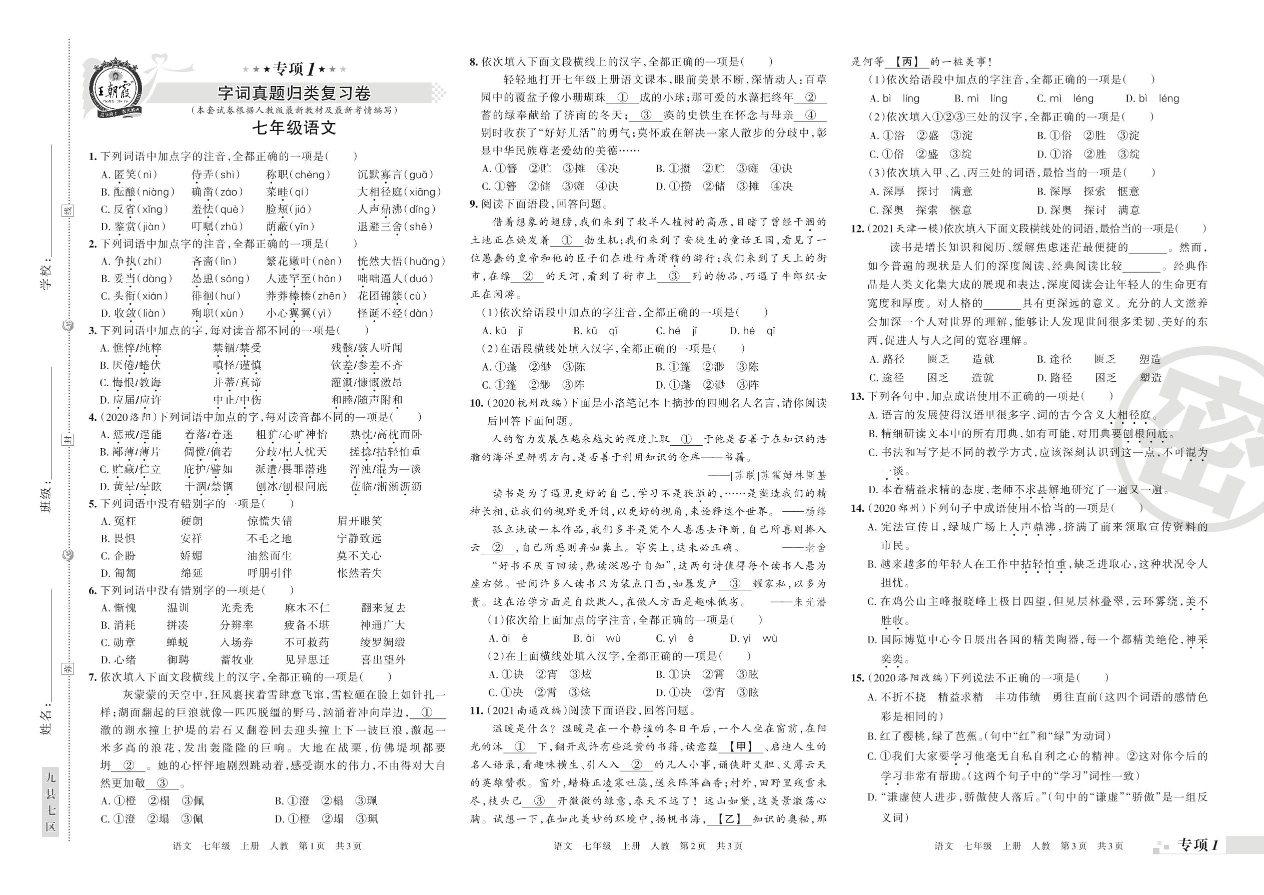 王朝霞期末专项卷——字词真题归类复习卷七年级上册语文(人教版)_R211207105720765【1】