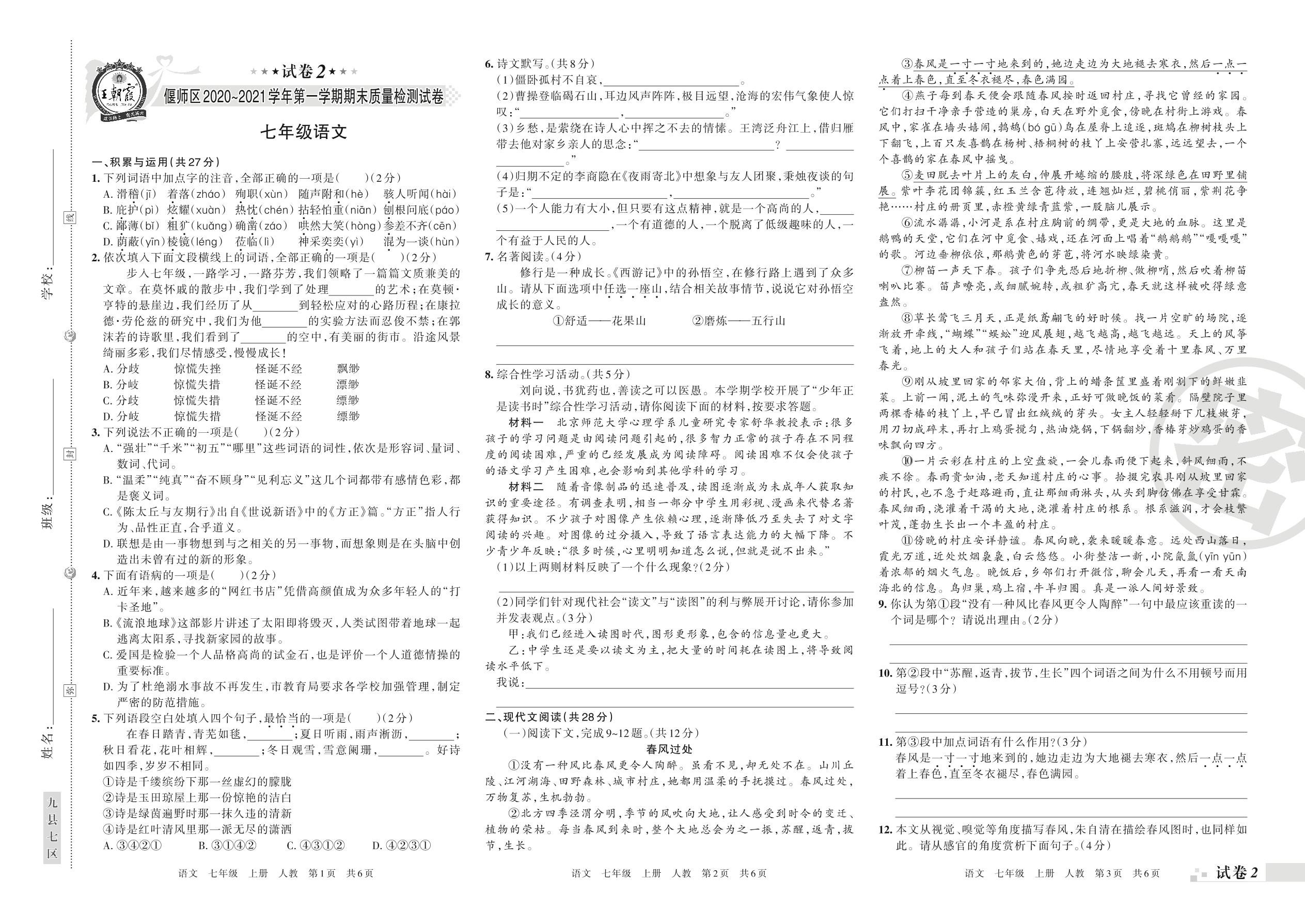 七年级语文人教版上册期末卷