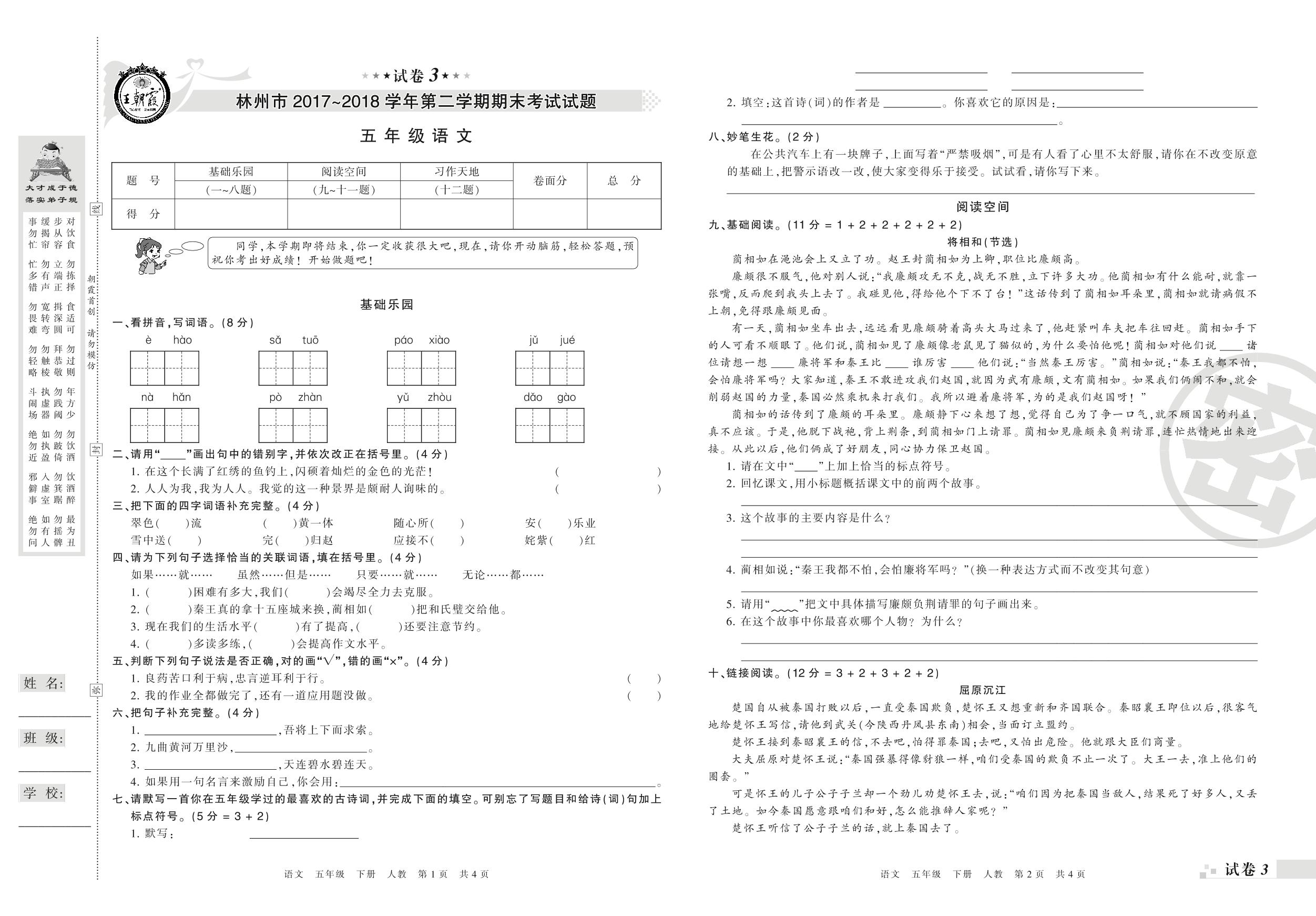 2017-2018学年第二学期林州市五年级语文试卷(人教版)【3】
