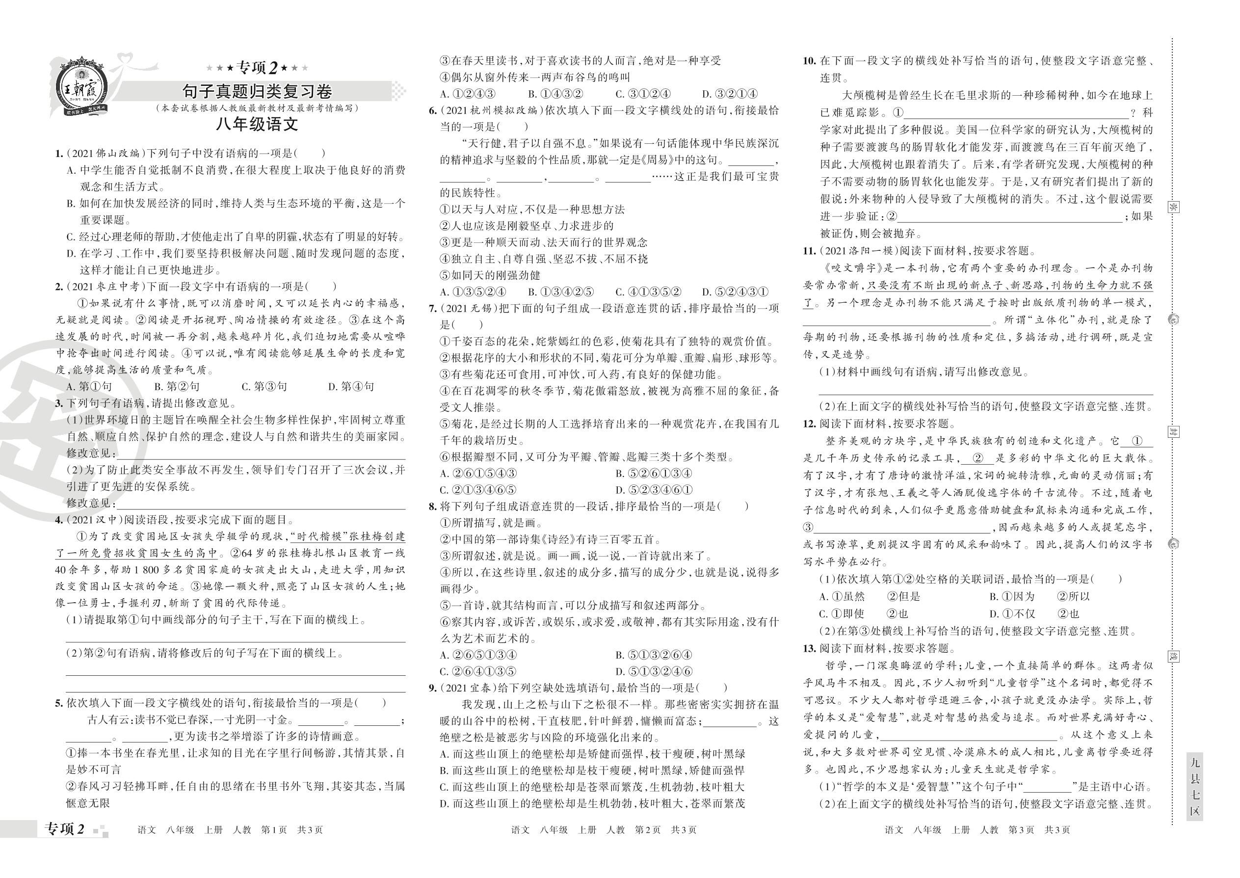 王朝霞期末专项卷——句子真题归类复习卷八年级上册语文(人教版)_R211207110121592【2】