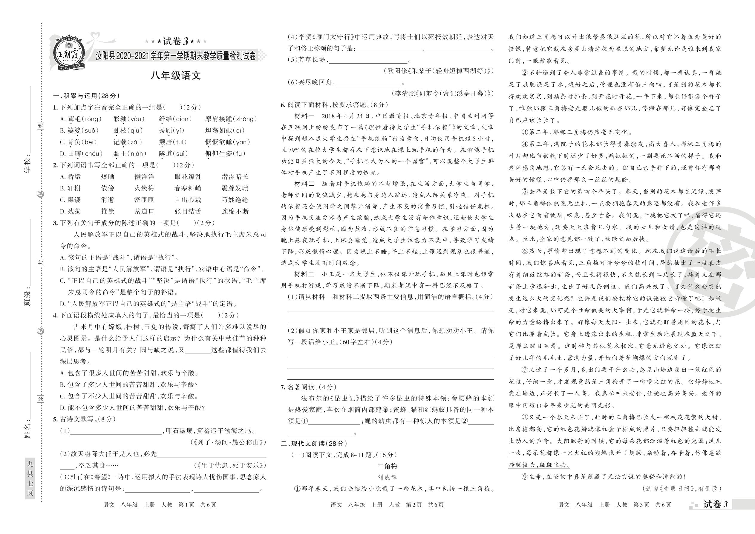 八年级语文人教版上册期末卷