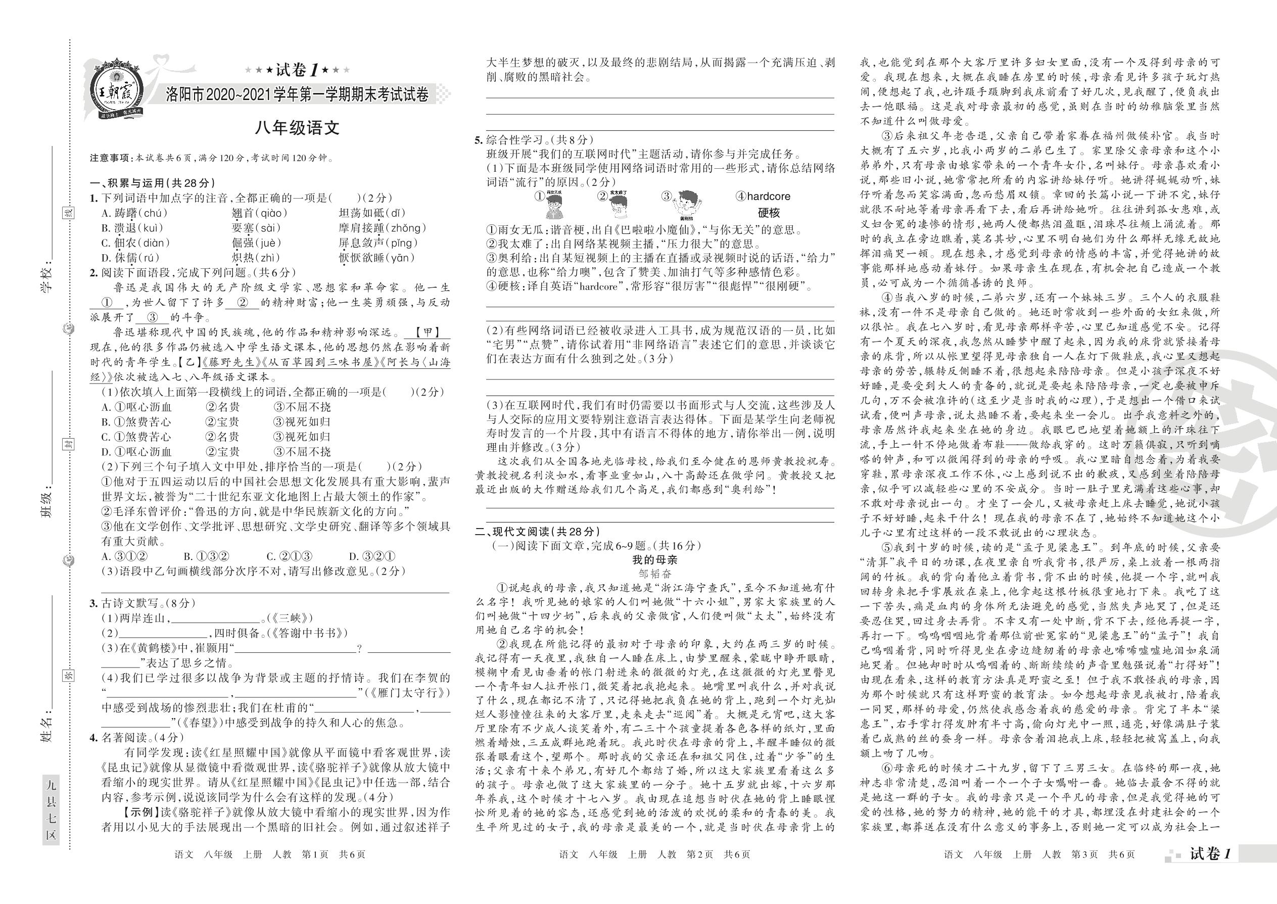 洛阳市2020~2021学年第一学期期末考试试卷八年级语文(人教版)【1】