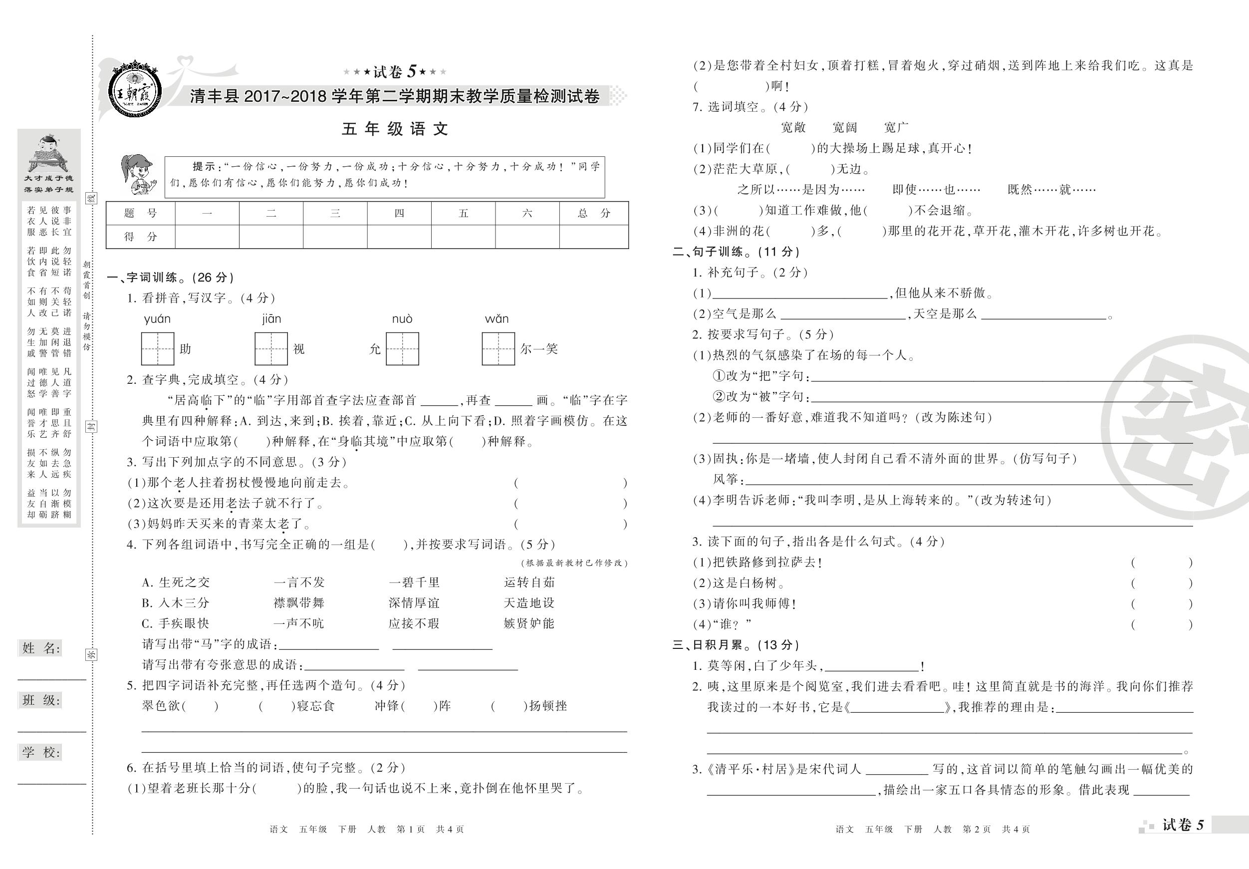 2017-2018学年第二学期濮阳市清丰县五年级语文试卷(人教版)【5】