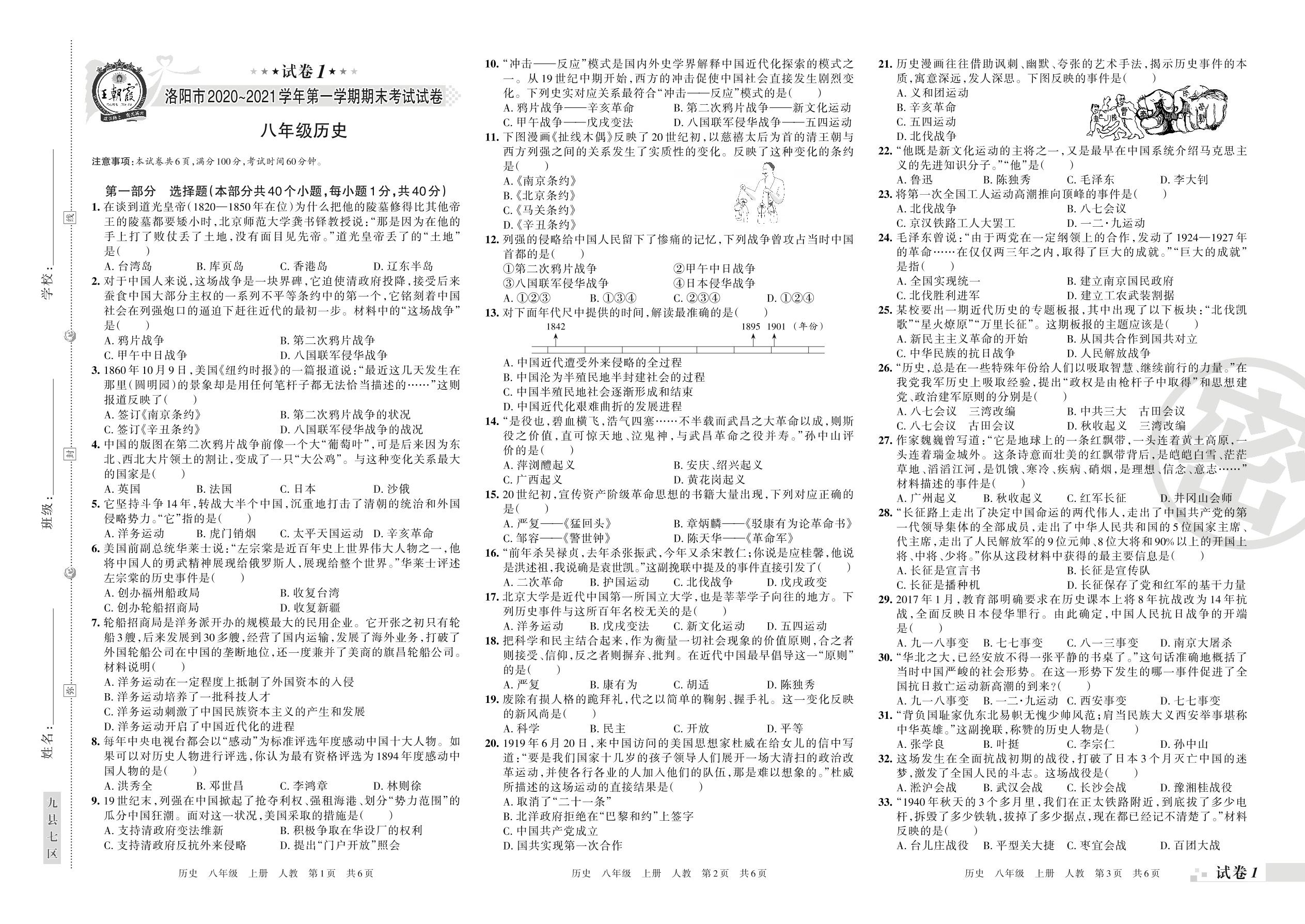 洛阳市2020~2021学年第一学期期末考试试卷八年级历史(人教版)【1】