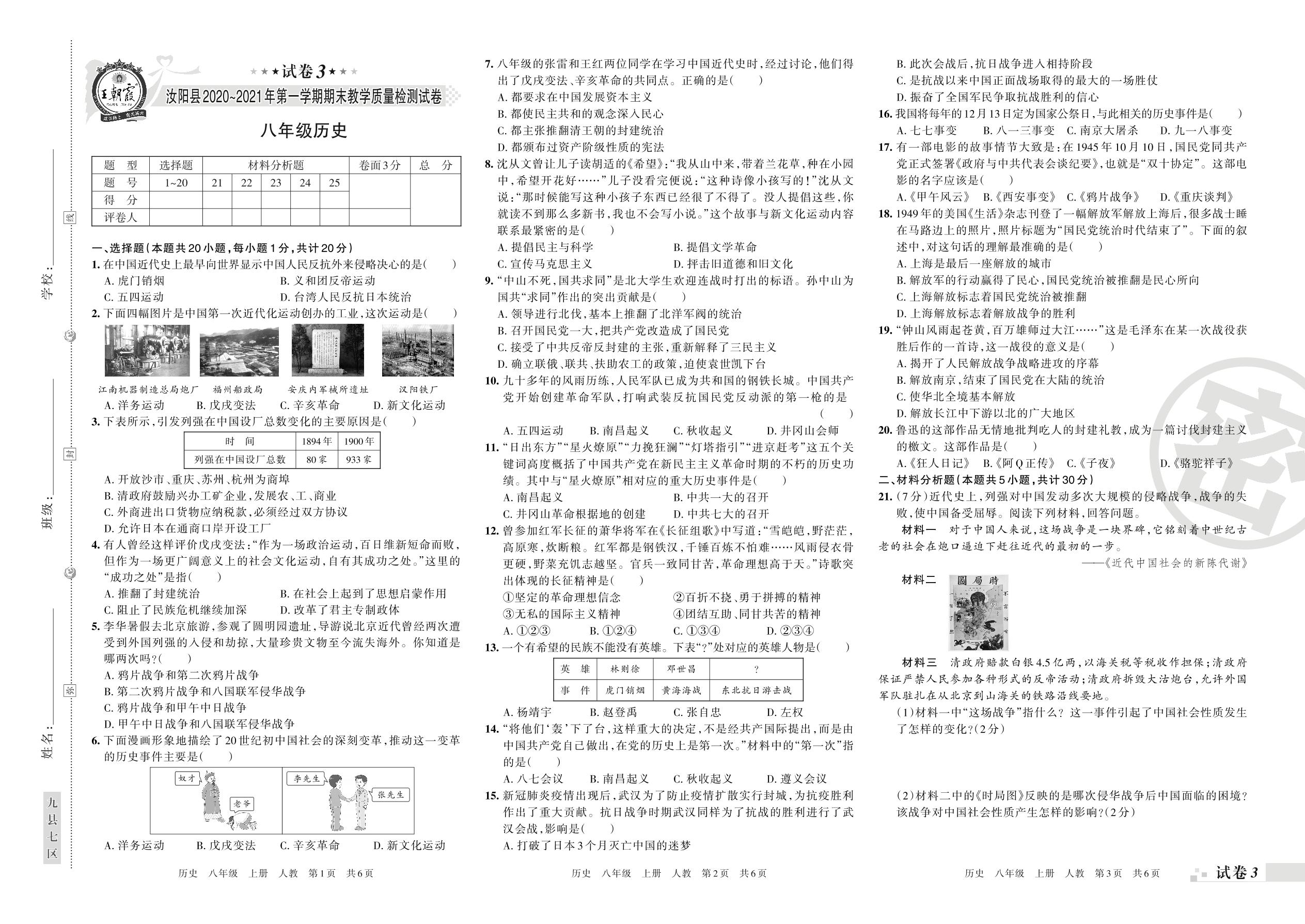 汝阳县2020~2021年第一学期期末教学质量检测试卷八年级历史(人教版)【3】