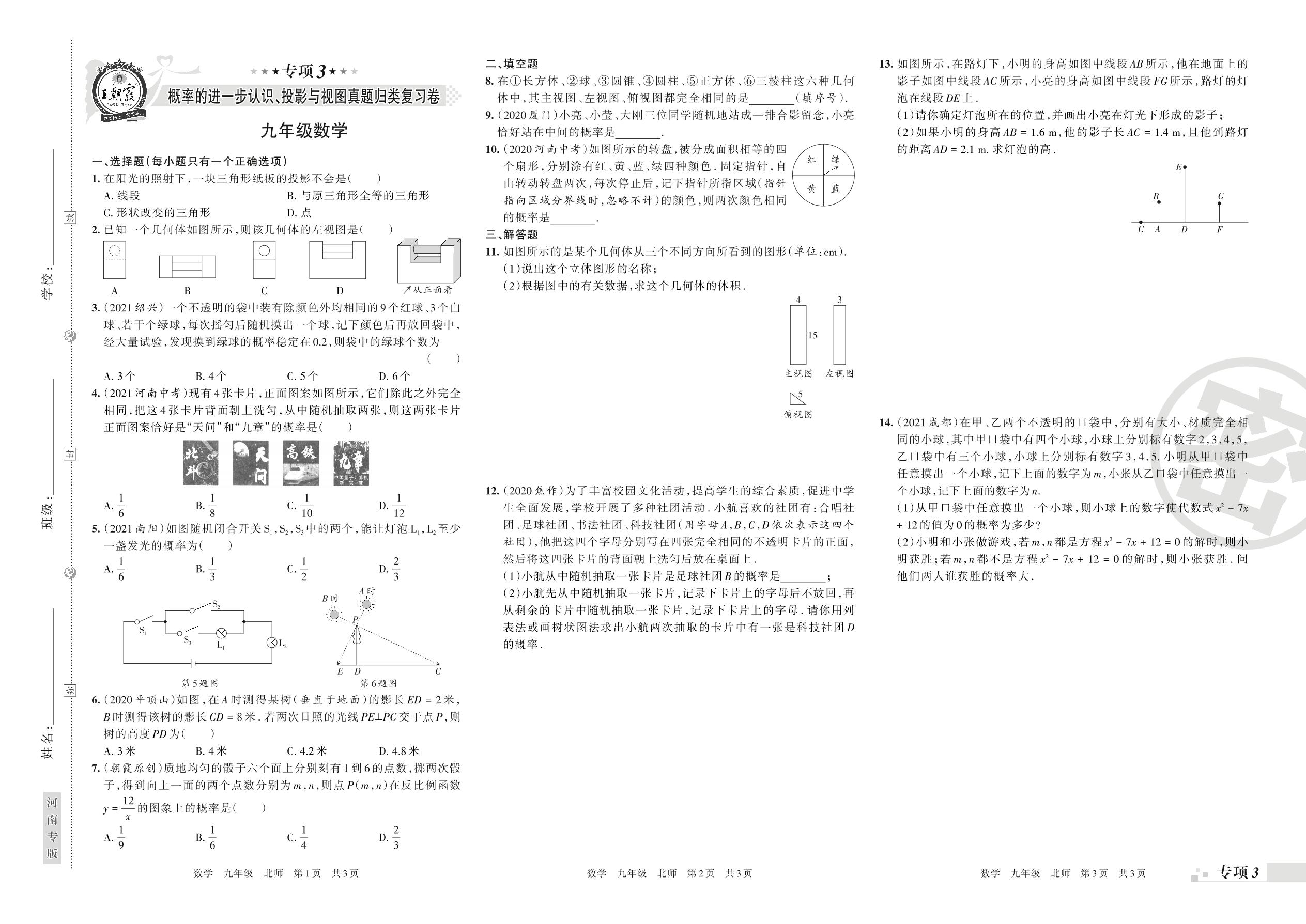 2021-2022学年第一学期王朝霞期末专项卷——概率的进一步认识、投影与视图真题归类复习卷九年级数学(北师版)【3】