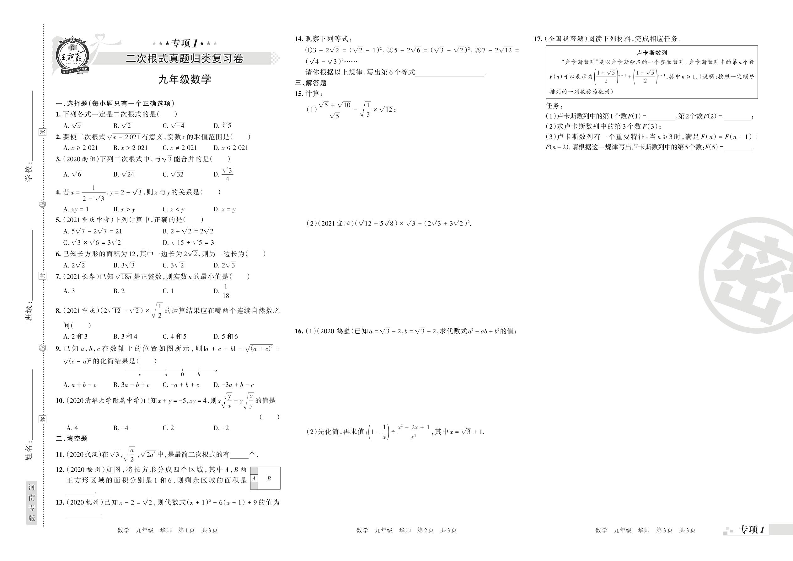 2021-2022学年第一学期王朝霞期末专项卷——二次根式真题归类复习卷九年级数学(华师版)【1】