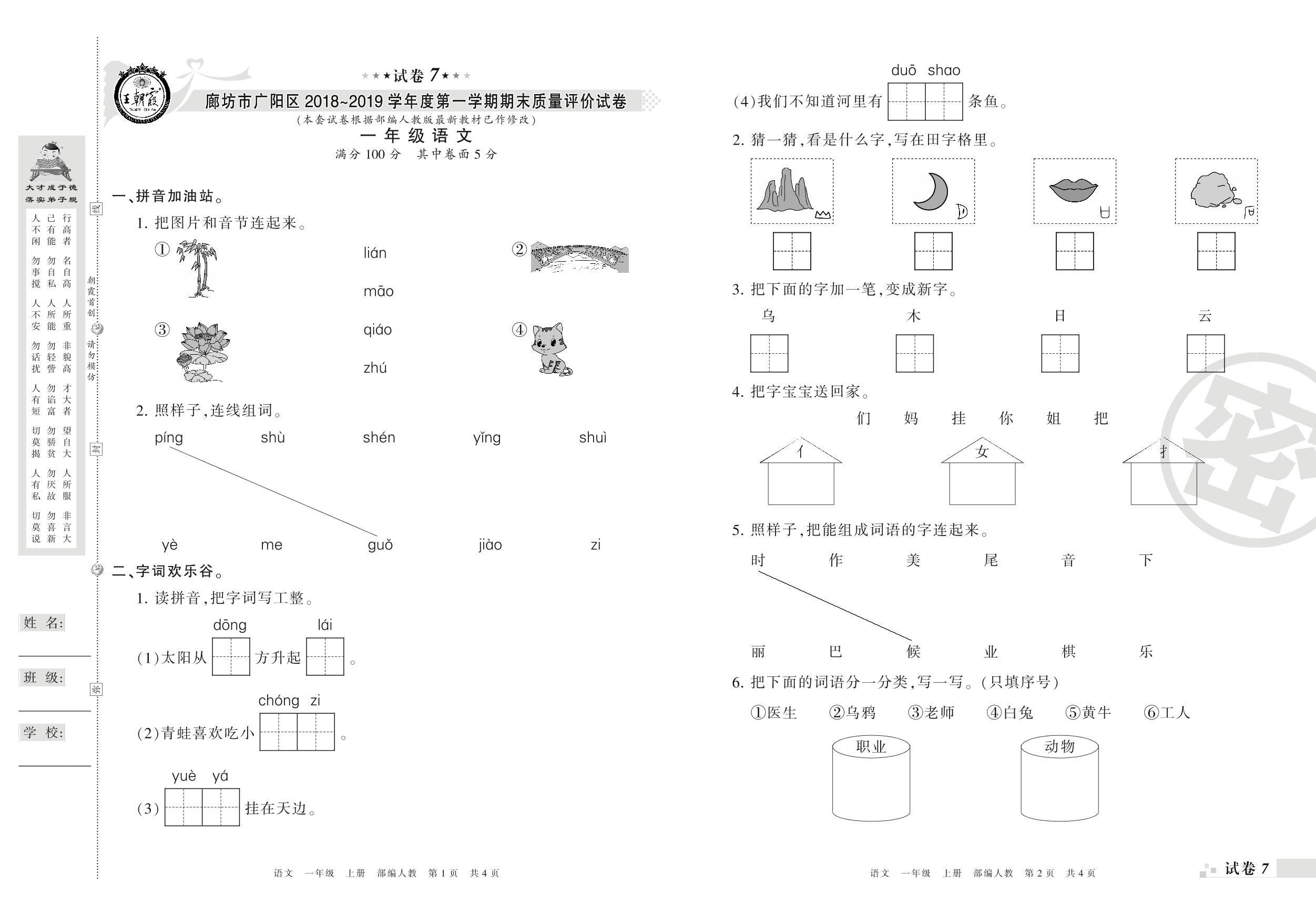 2018-2019学年第一学期廊坊市广阳区一年级语文试卷(人教版)【7】