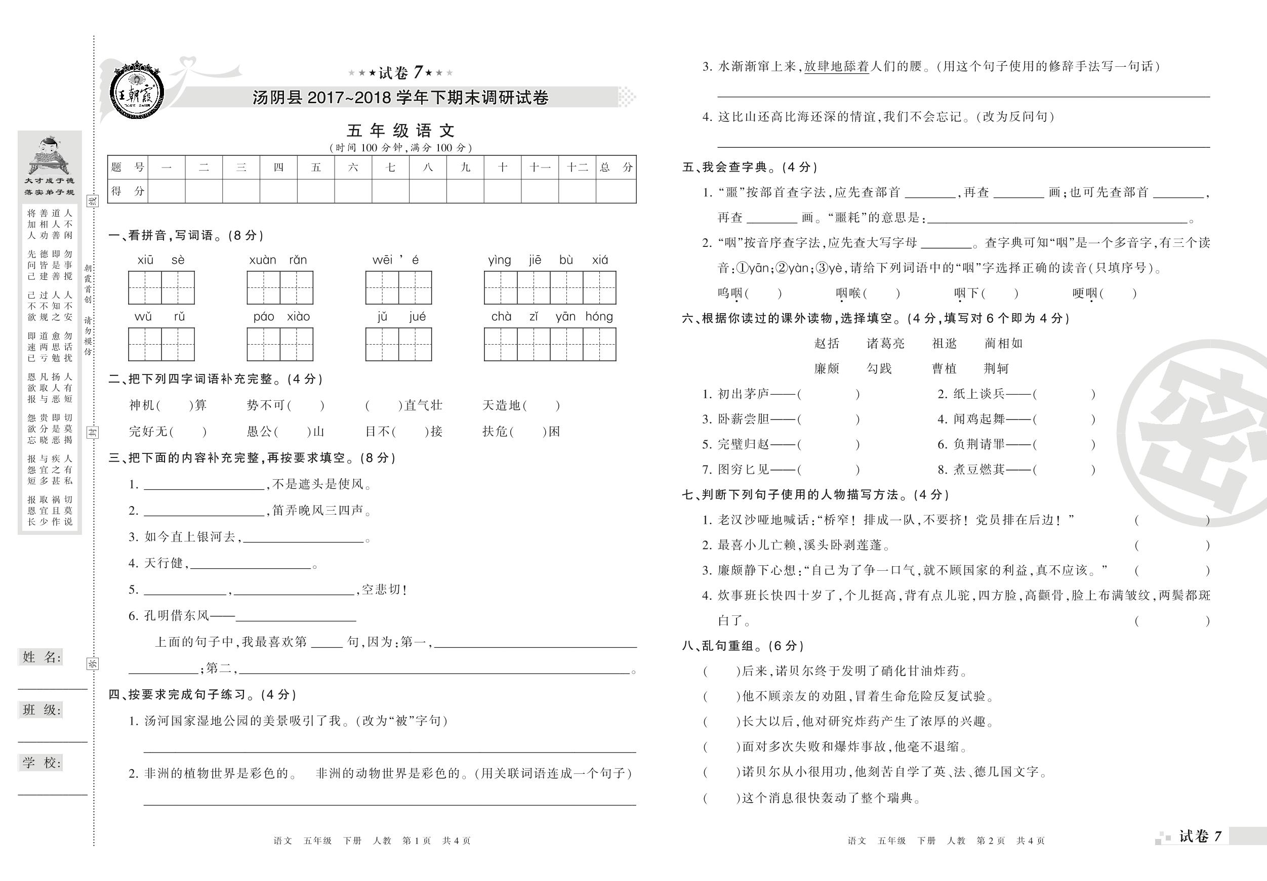 2017-2018学年第二学期安阳市汤阴县五年级语文试卷(人教版)【7】