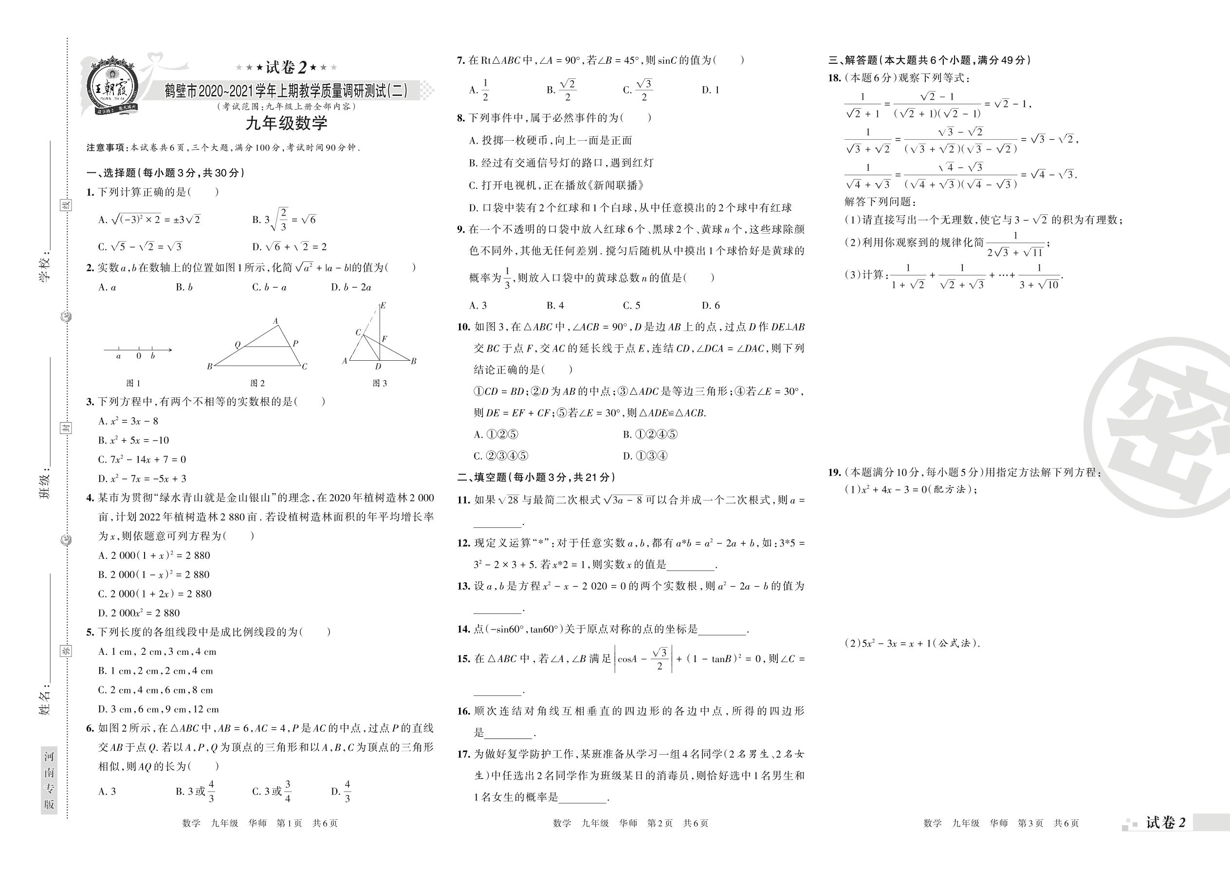 鹤壁市2020~2021学年上期教学质量调研测试(二)九年级数学(华师版)【2】