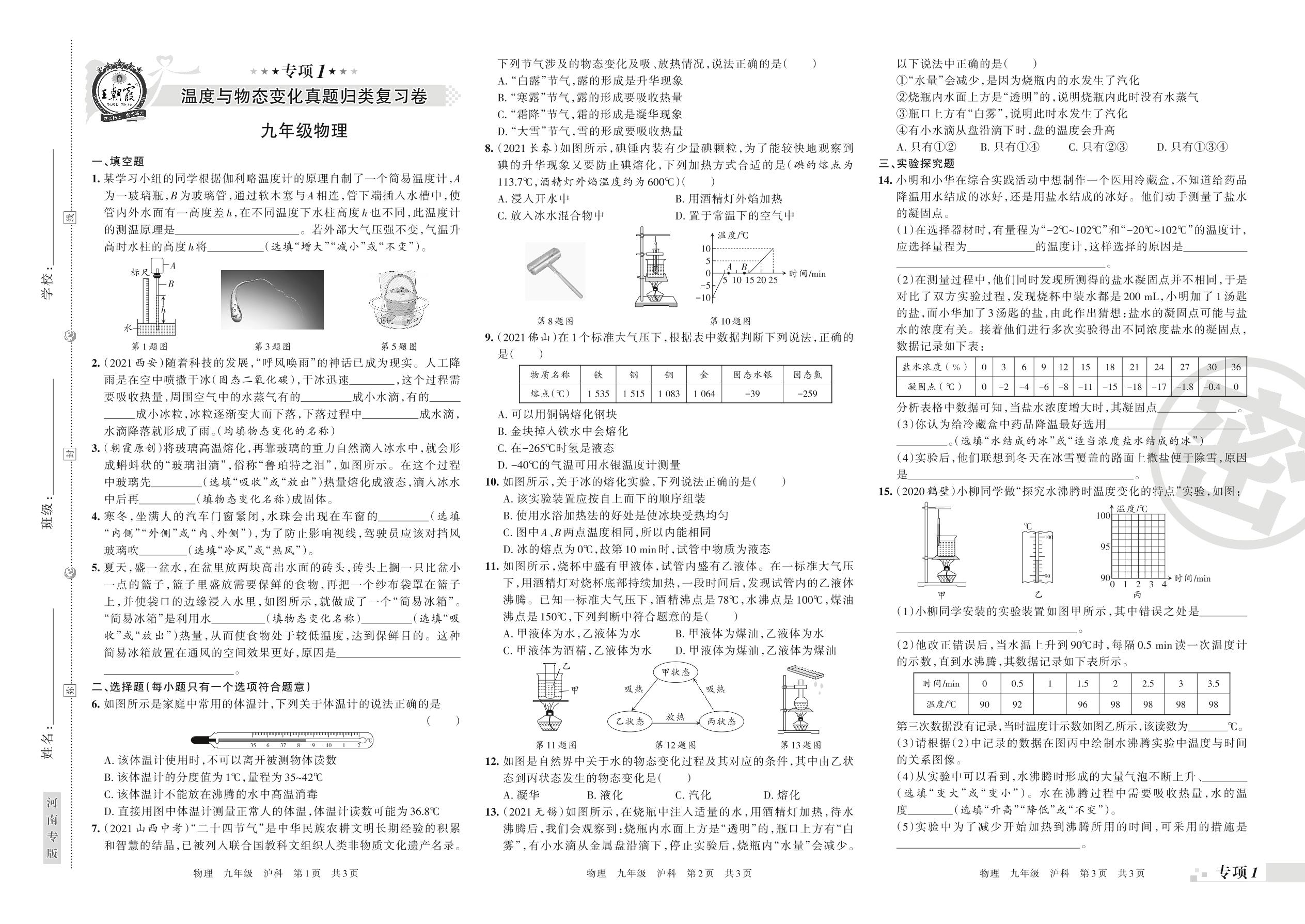 2021-2022学年第一学期王朝霞期末专项卷——温度与物态变化真题归类复习卷九年级物理(沪科版)【1】
