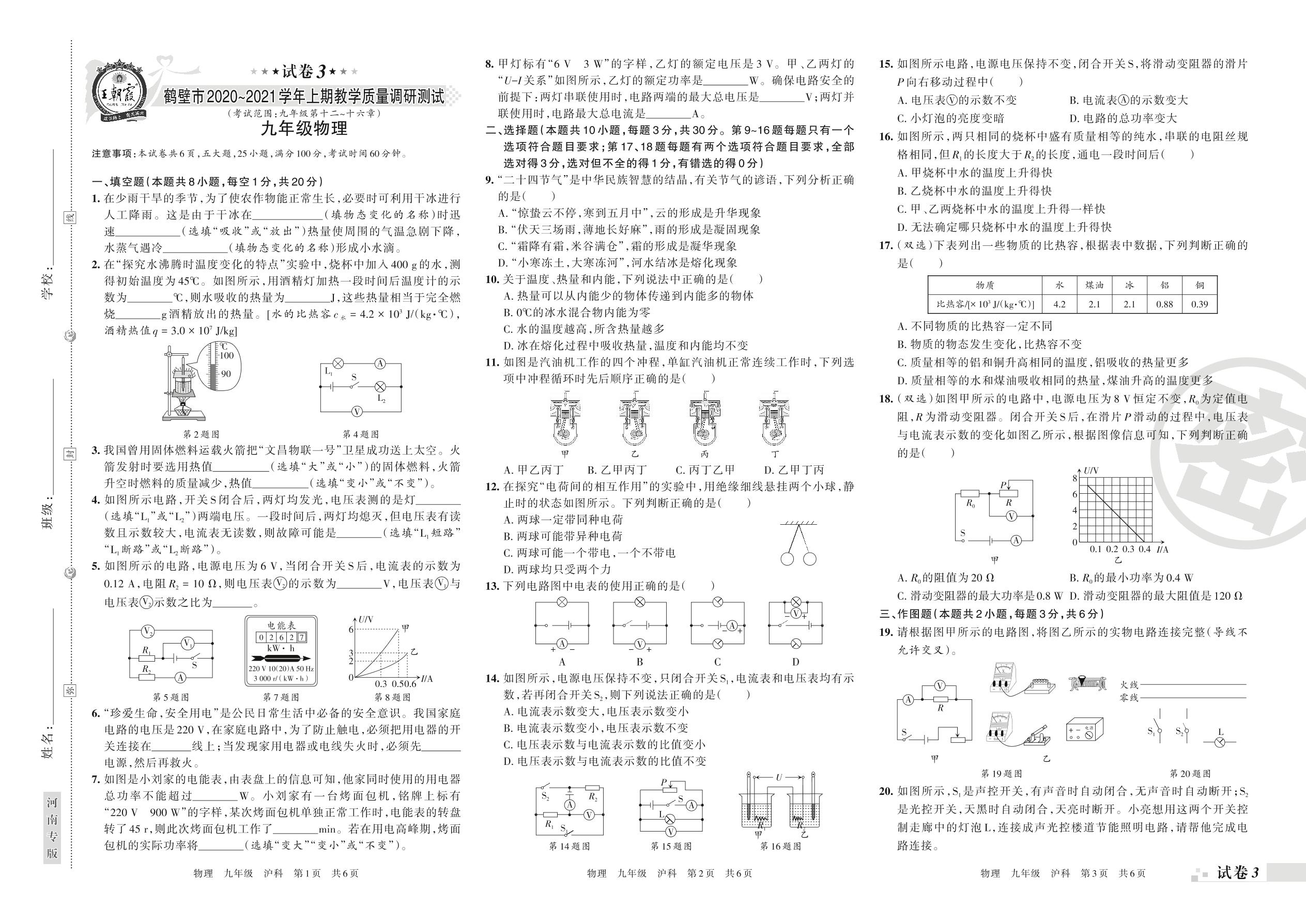 鹤壁市2020~2021学年上期教学质量调研测试九年级物理(沪科版)【3】