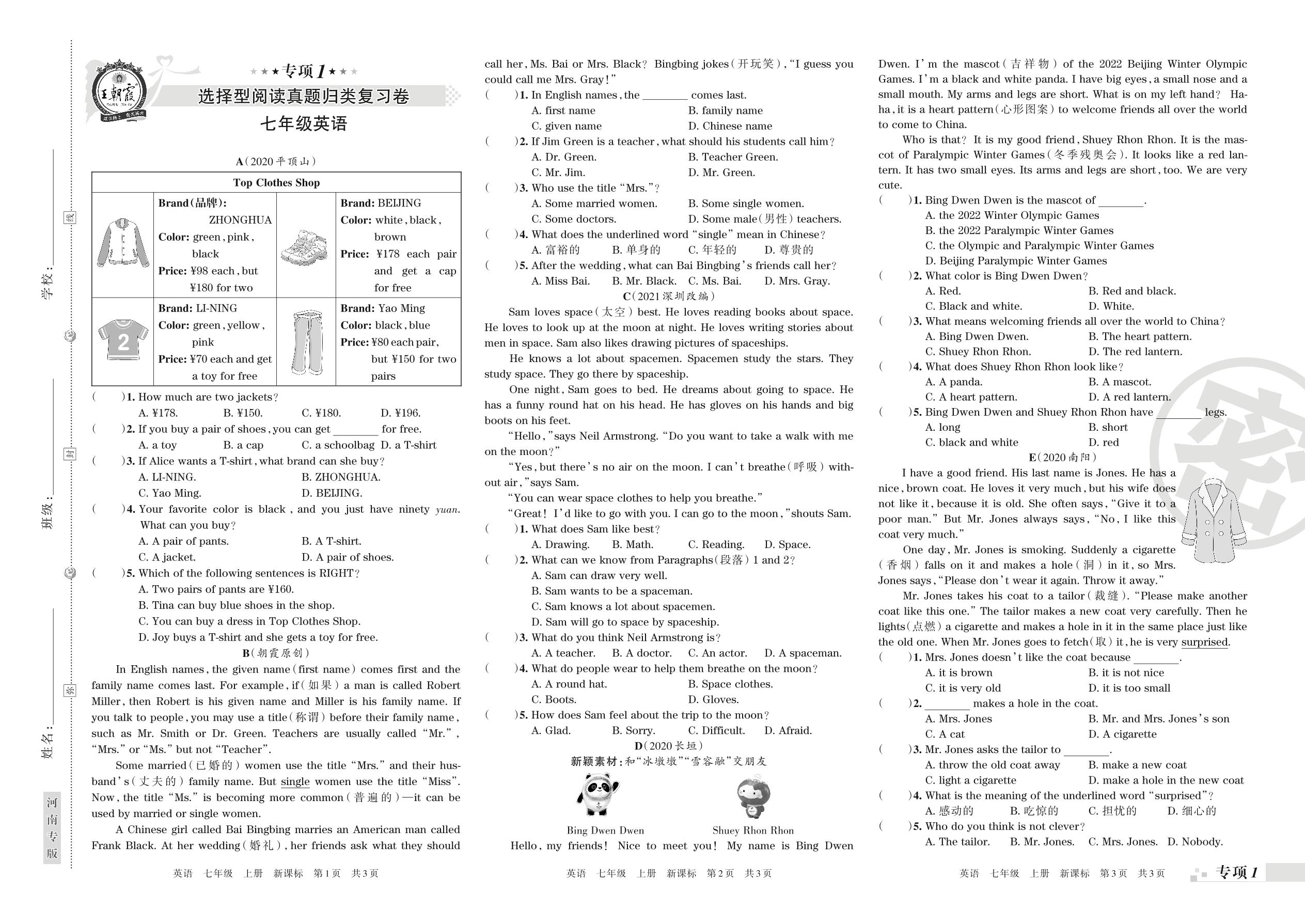 王朝霞期末专项卷——选择型阅读真题归类复习卷七年级上册英语(新课标版)_R211207141341833【1】