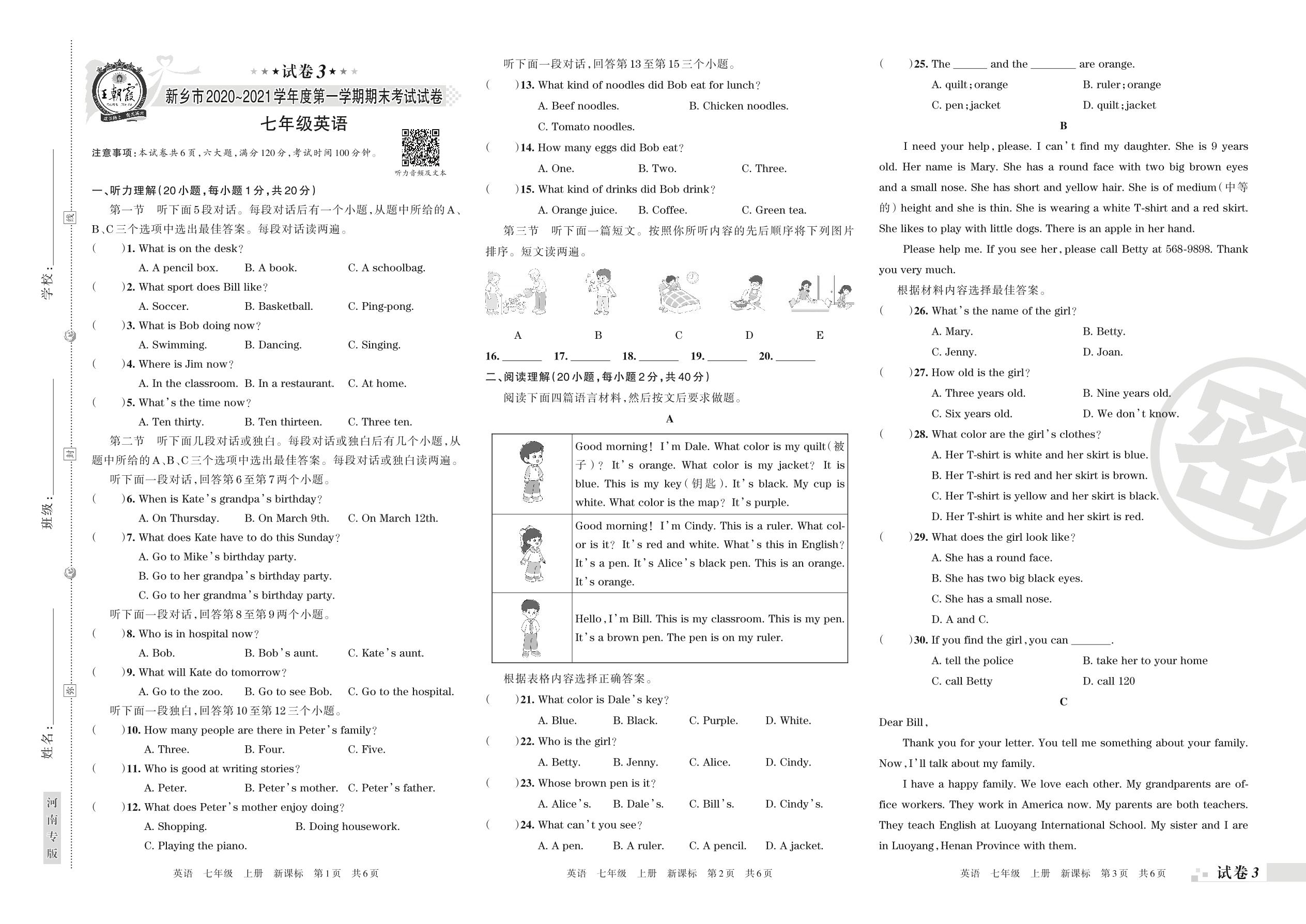 新乡市2020~2021学年度第一学期期末考试试卷七年级英语(新课标版)【3】