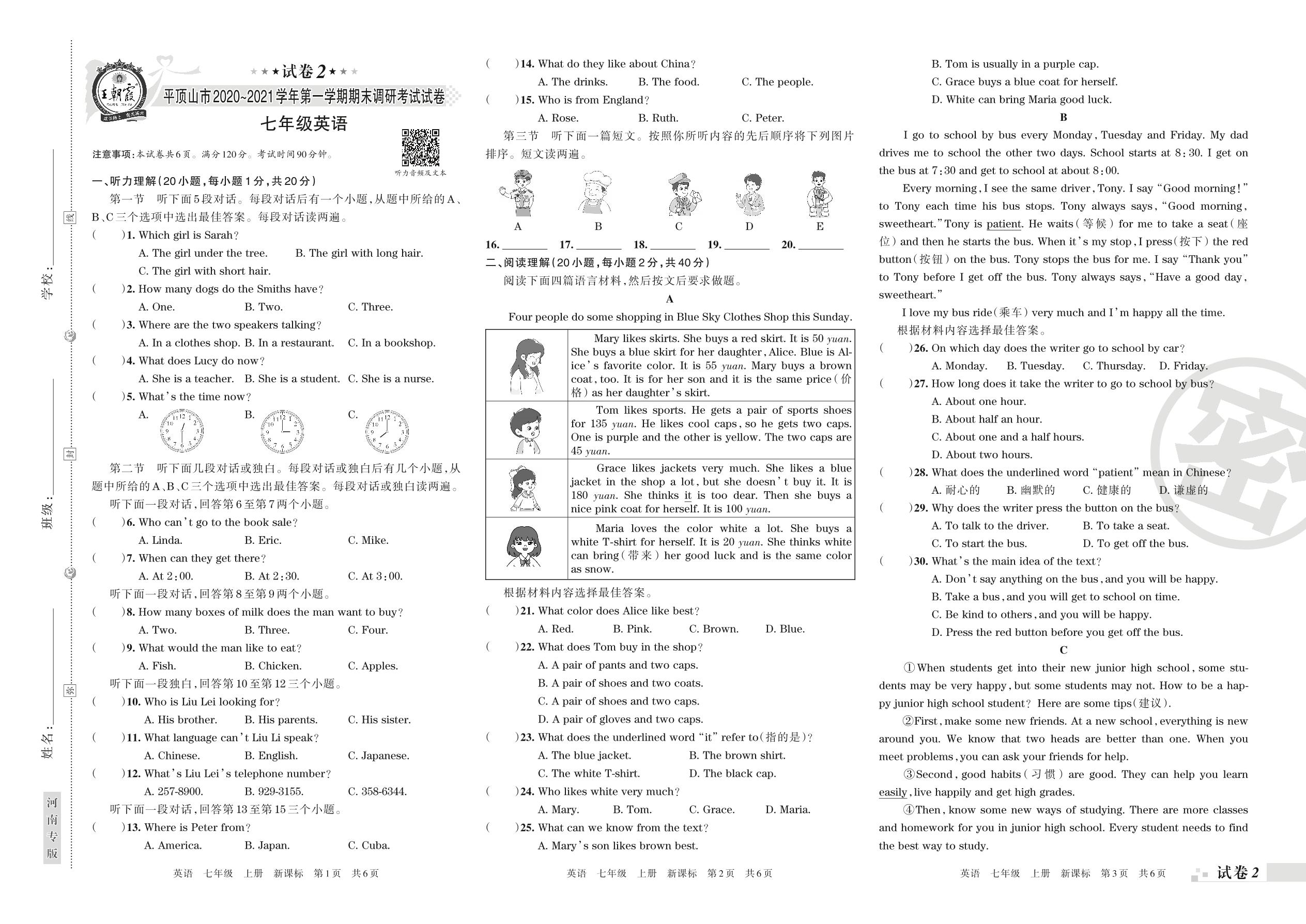 平顶山市2020~2021学年第一学期期末调研考试试卷七年级英语(新课标版)【2】