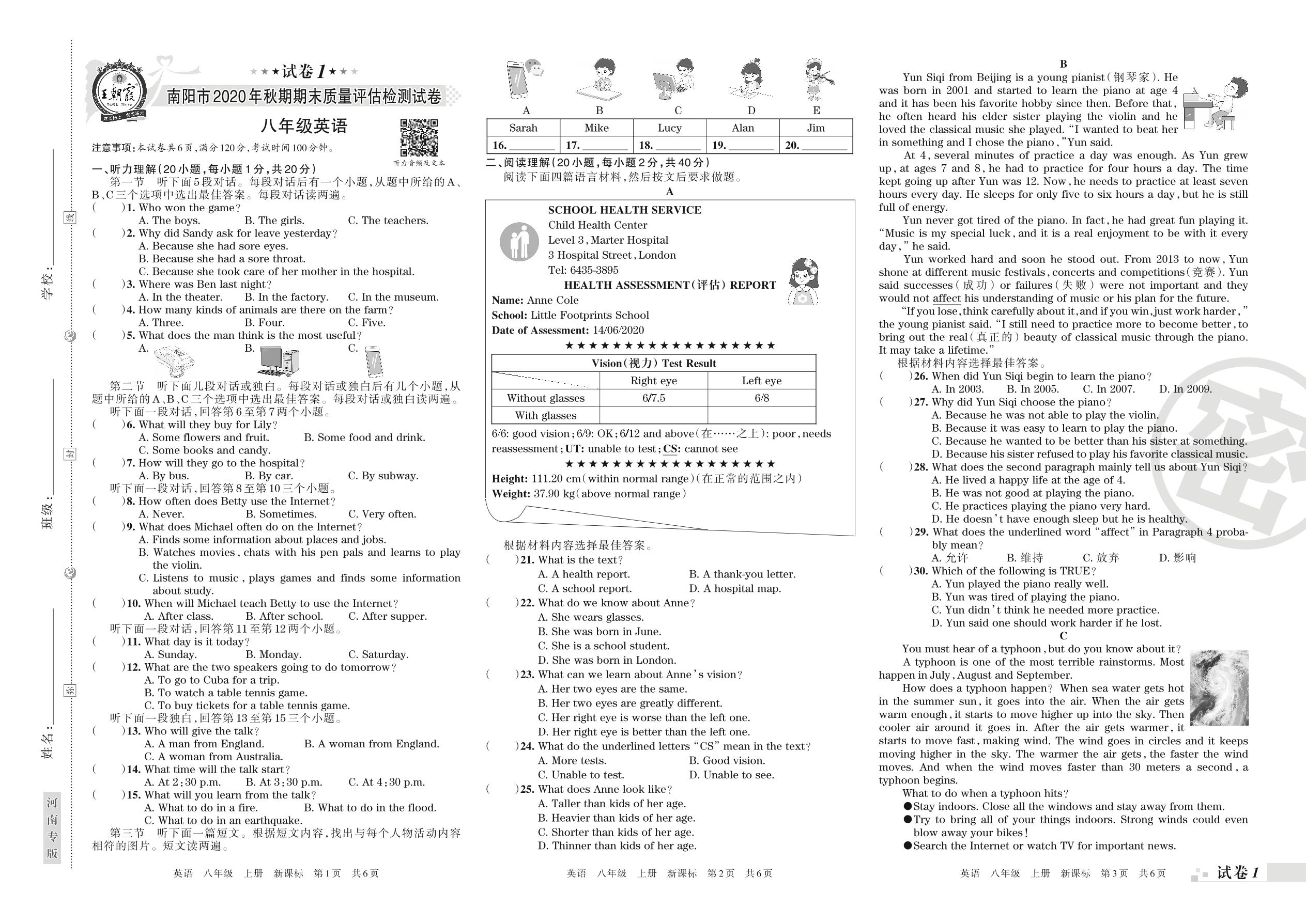 南阳市2020年秋期期末质量评估检测试卷八年级英语(新课标版)【1】