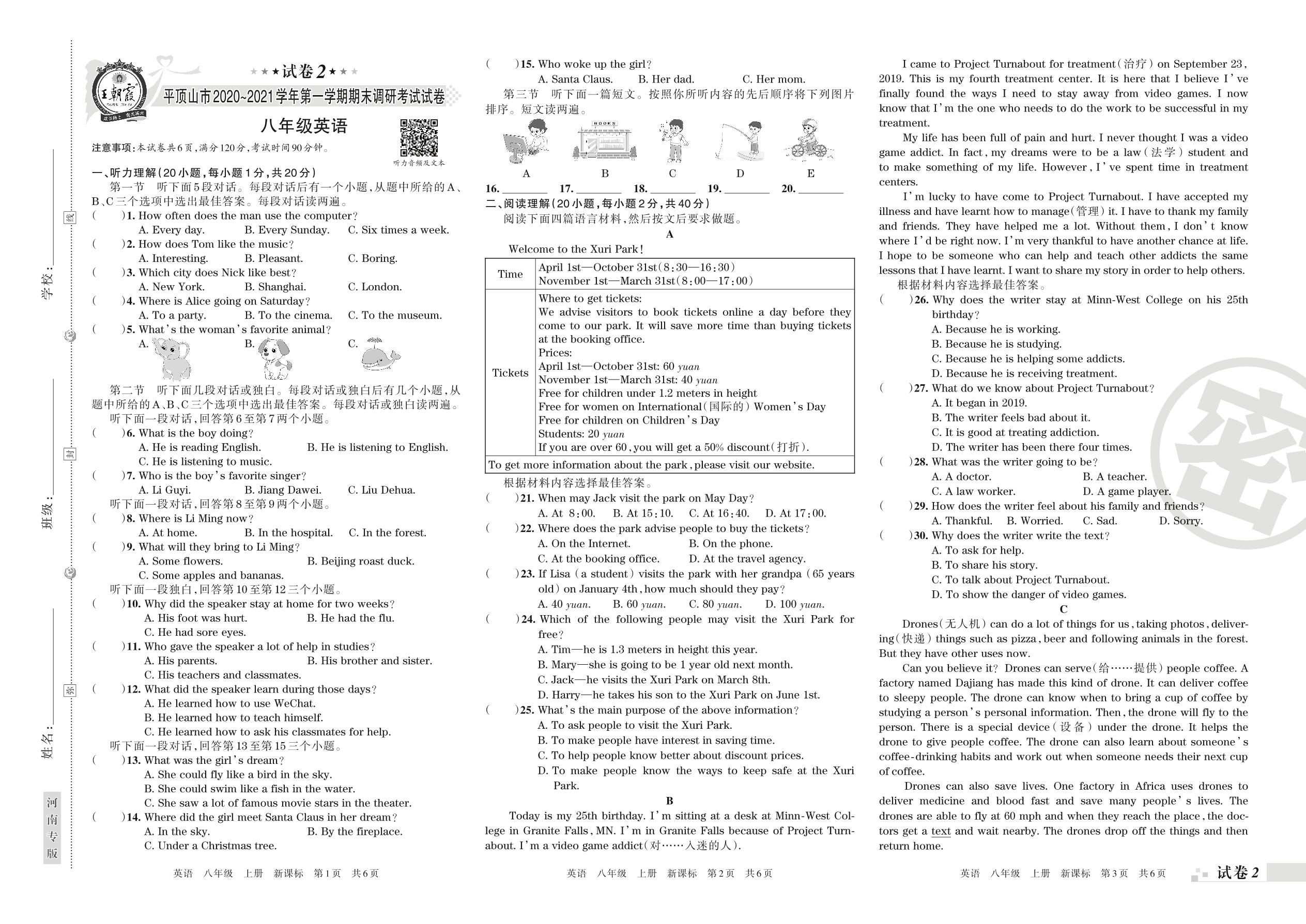 平顶山市2020~2021学年第一学期期末调研考试试卷八年级英语(新课标版)【2】