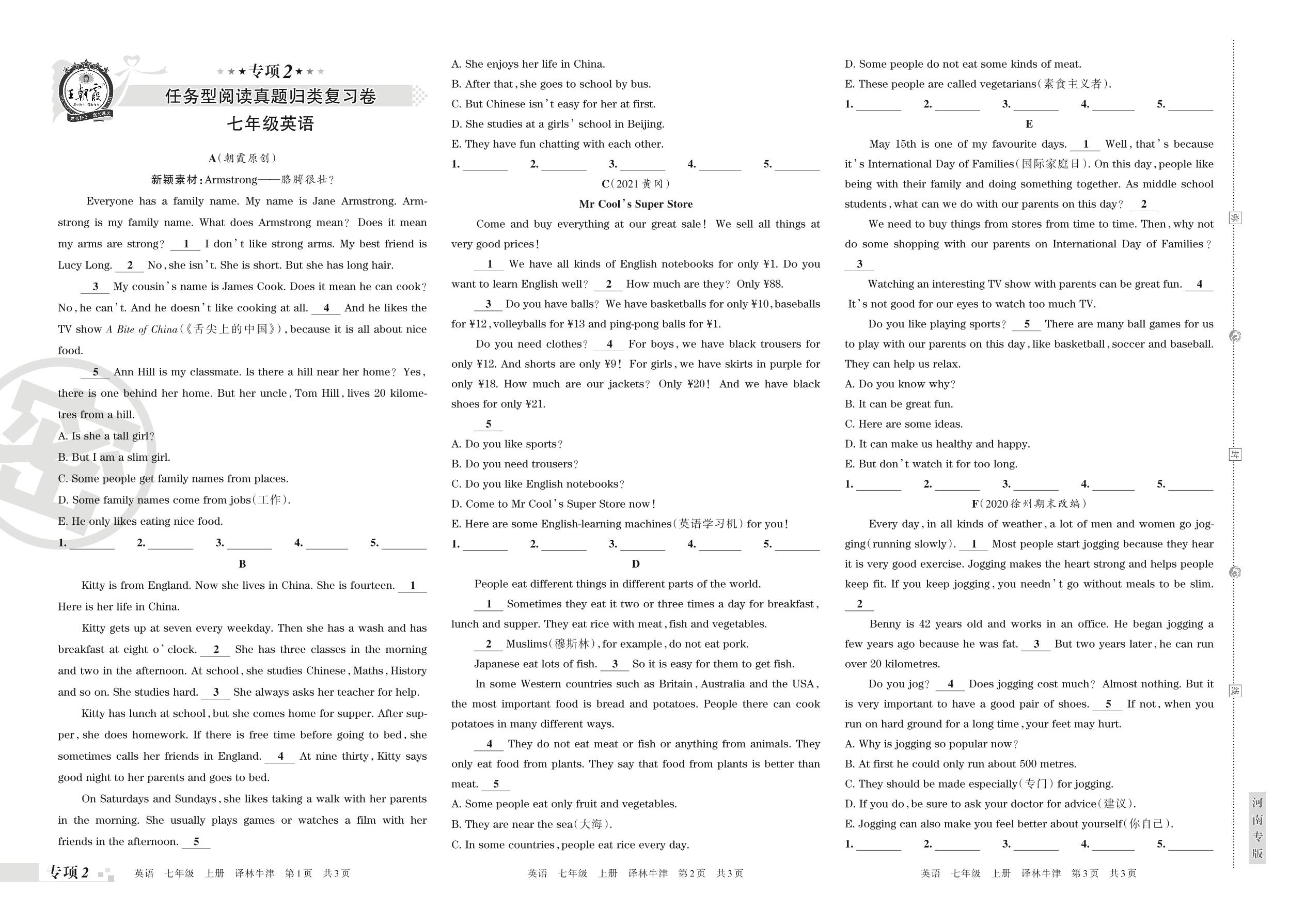 王朝霞期末专项卷——任务型阅读真题归类复习卷七年级上册英语(译林牛津版)【2】