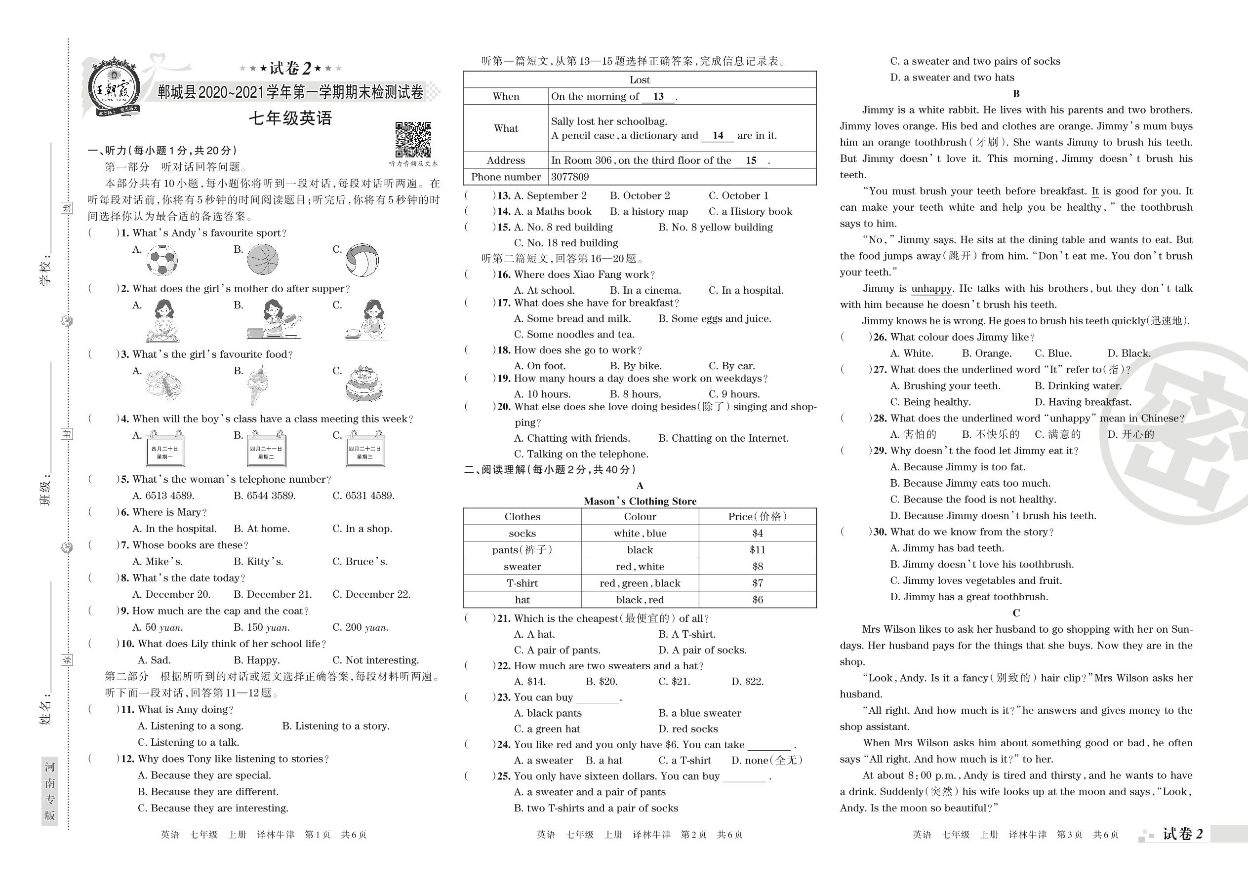 郸城县2020~2021学年第一学期期末检测试卷七年级英语(译林牛津版)【2】