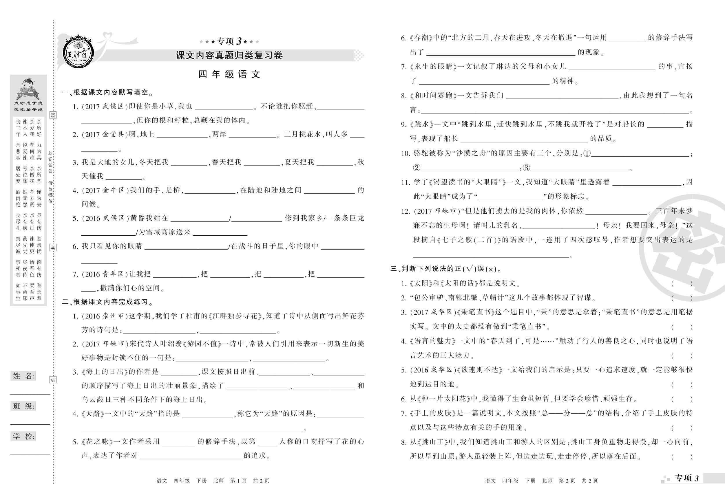 王朝霞期末专项卷——课文内容、积累运用真题归类复习卷四年级下册语文(北师版)_R210801205325【0】