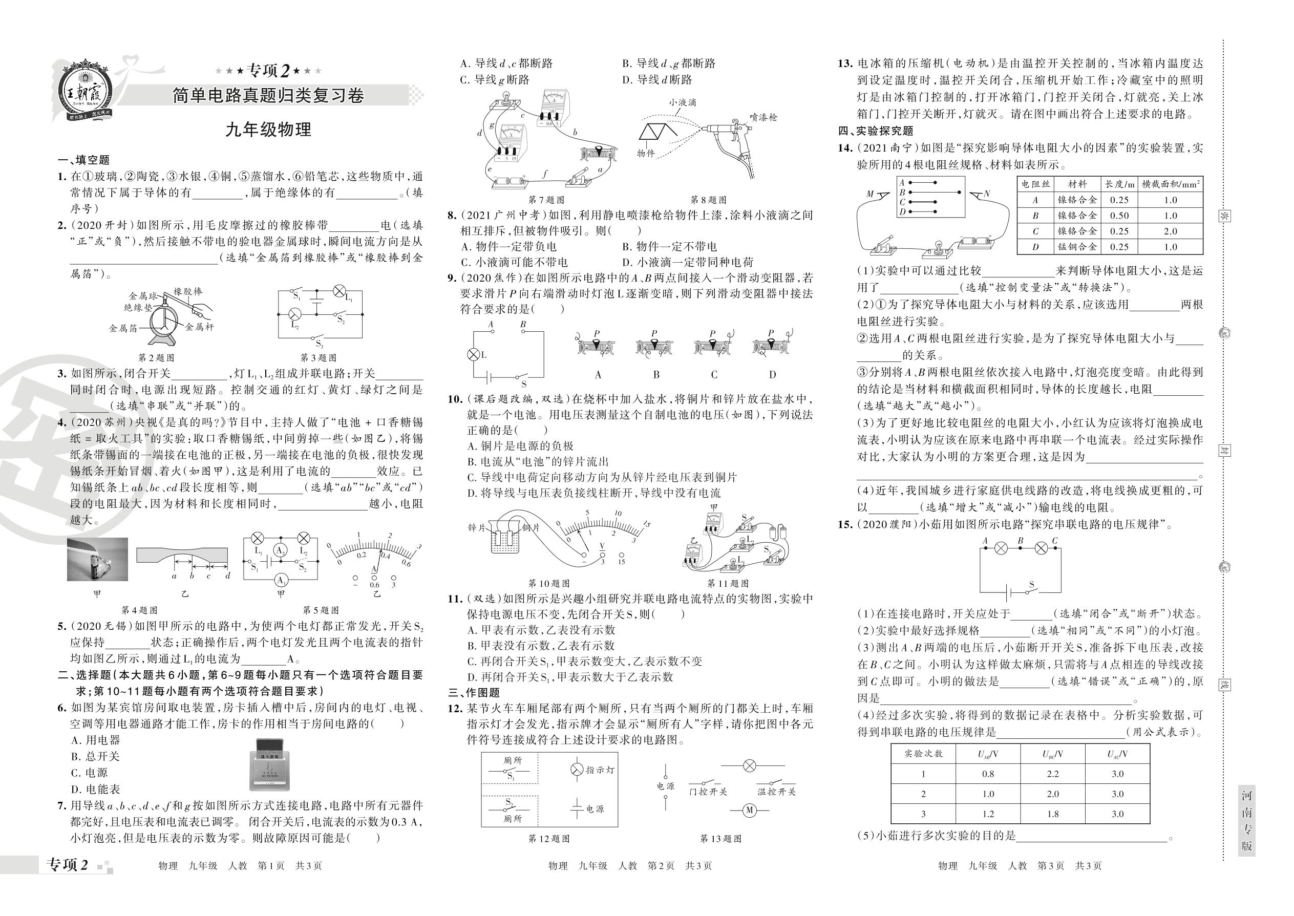 2021-2022学年第一学期王朝霞期末专项卷——简单电路真题归类复习卷九年级物理(人教版)_R211208143143996【2】