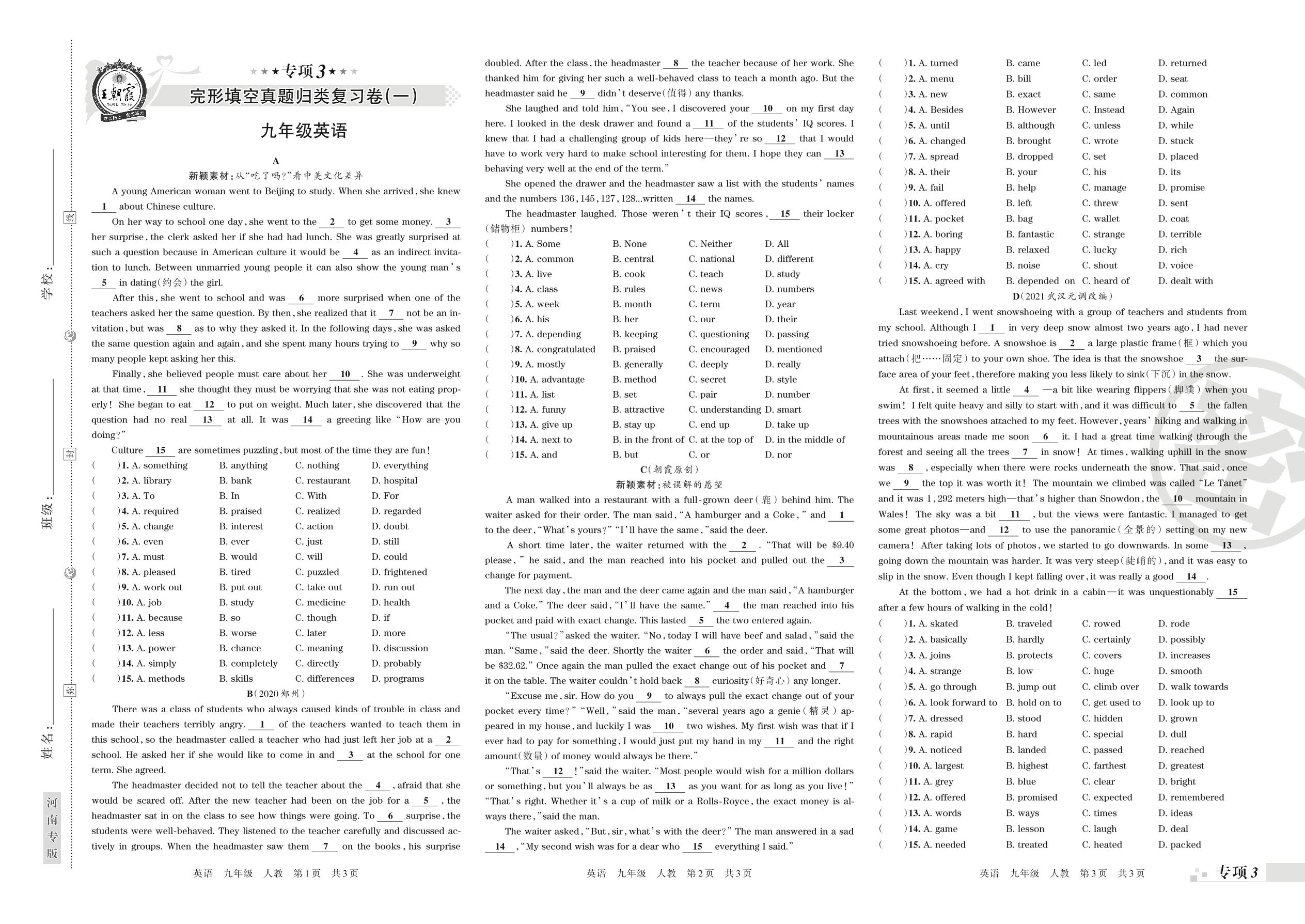 2021-2022学年第一学期王朝霞期末专项卷——完形填空真题归类复习卷(一)九年级英语(人教版)【3】