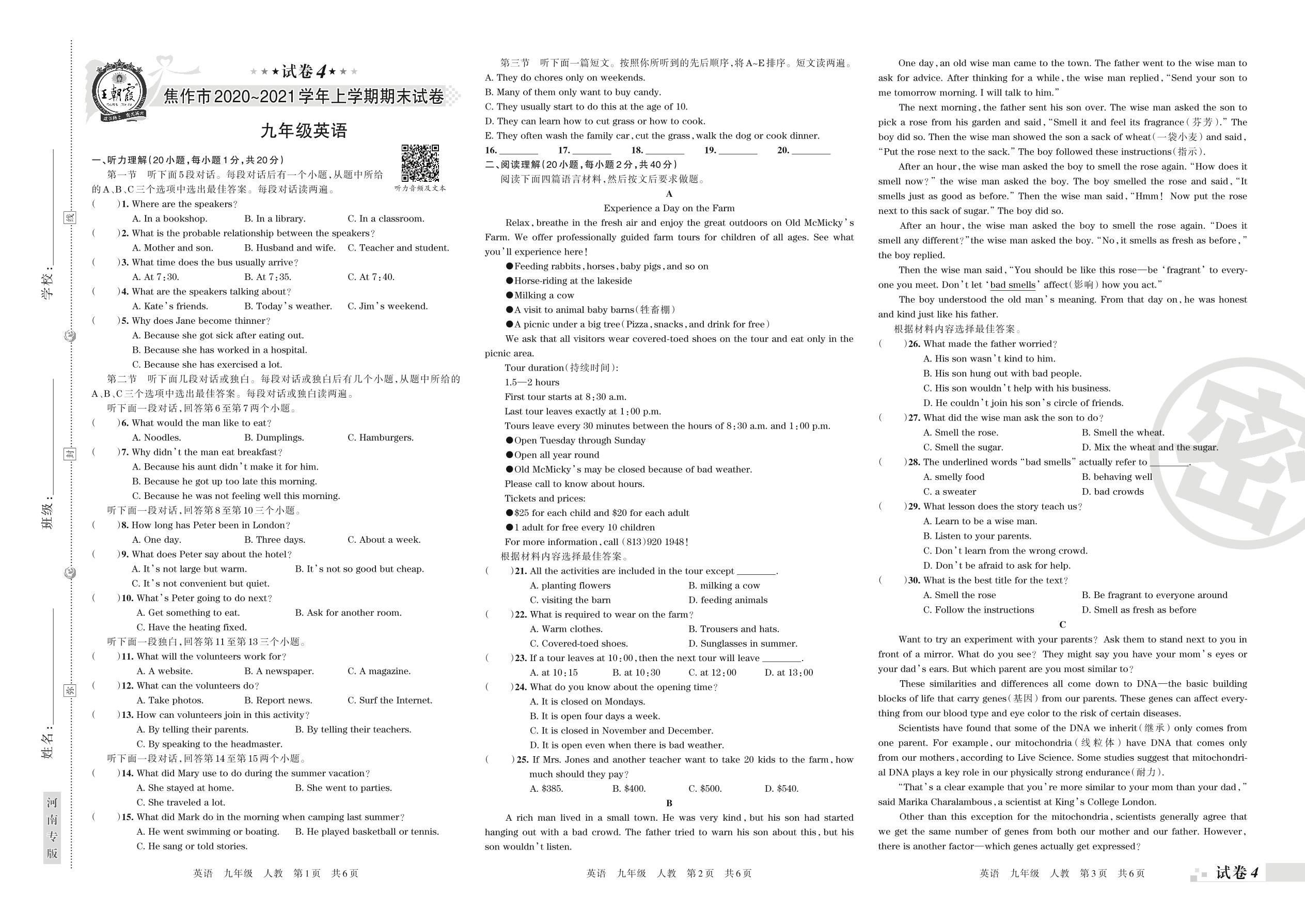 焦作市2020~2021学年上学期期末试卷九年级英语(人教版)【4】