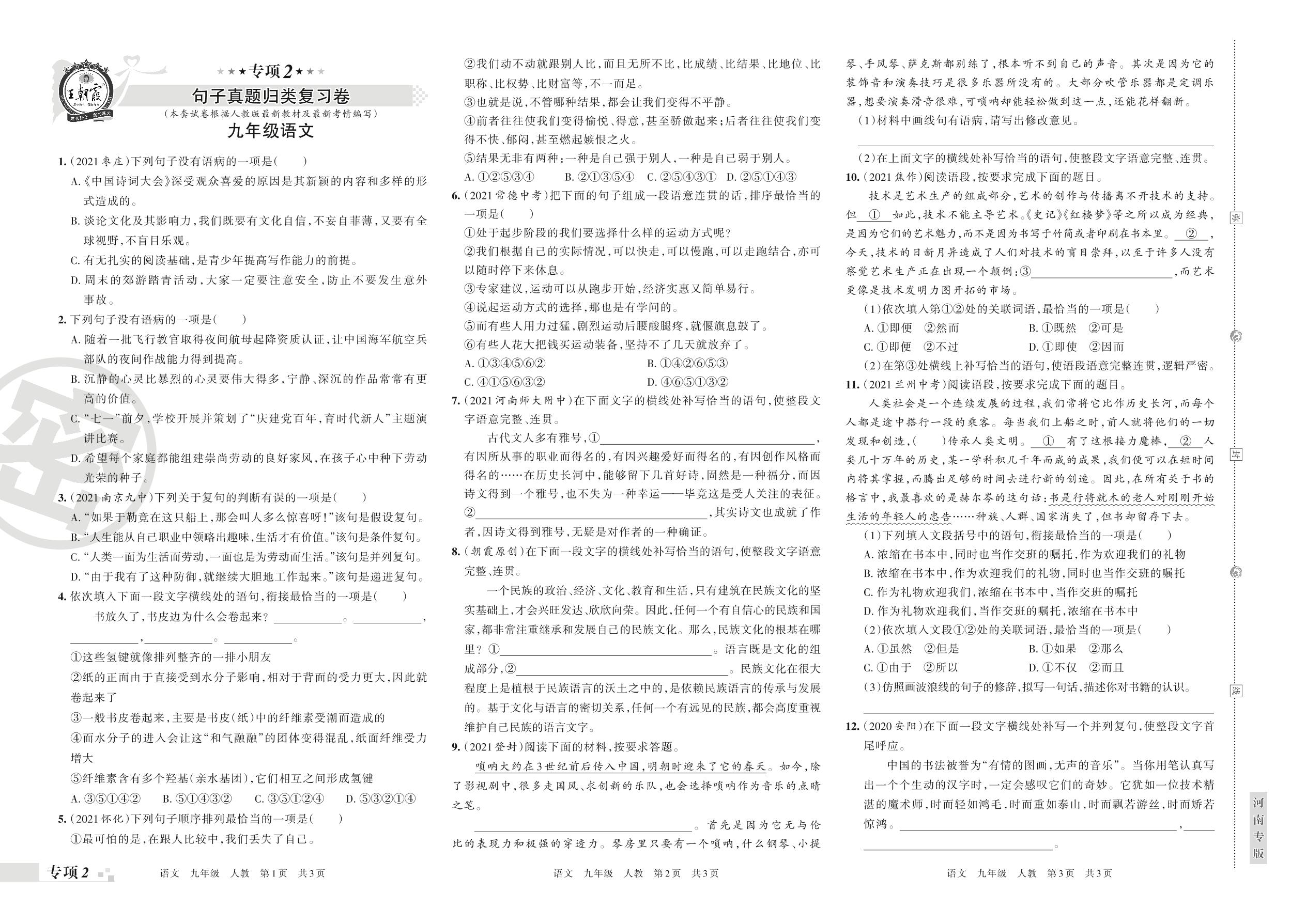 2021-2022学年第一学期王朝霞期末专项卷——句子真题归类复习卷九年级语文(人教版)【2】