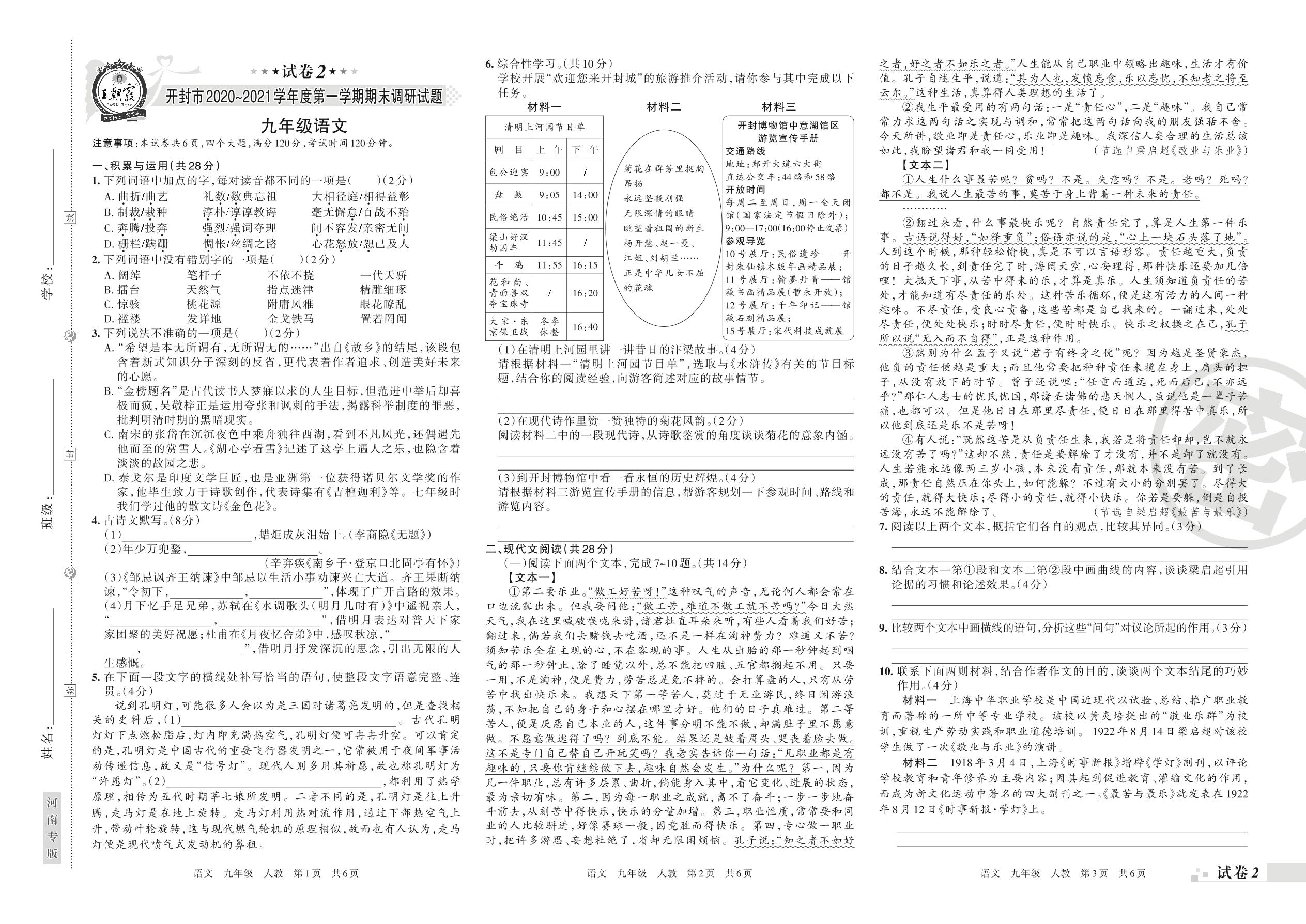 开封市2020~2021学年度第一学期期末调研试题九年级语文(人教版)【2】